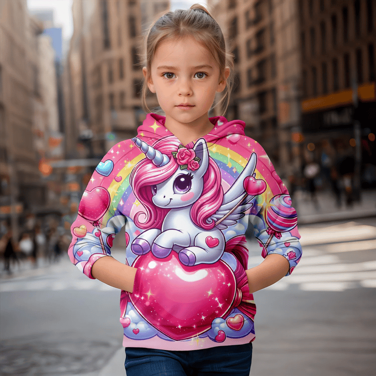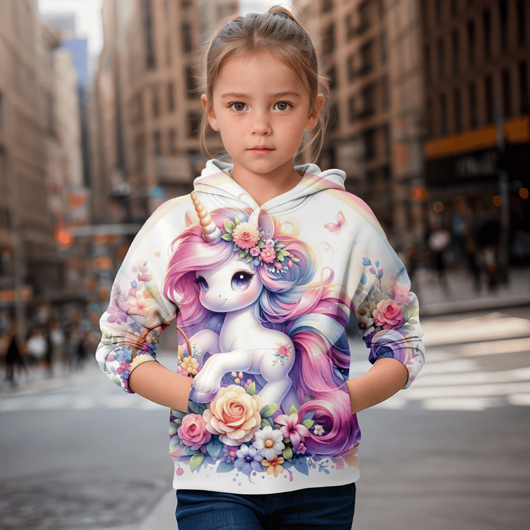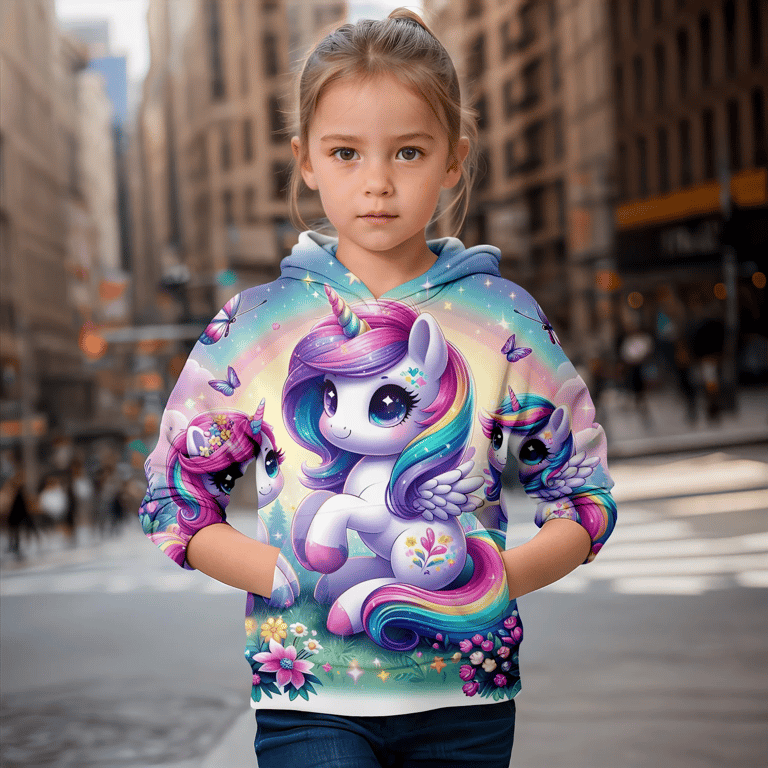 Girls' designer sweatshirt with a 3D print - unicorn. Material: 70% cotton, 30% polyester Size chart (cm) Size | Sweatshirt length | Chest circumference | Sleeve length | Height of wearer 100 | 44 | 64 | 42 | 90 - 105 110 | 46 | 66 | 44 | 105 - 115 120 | 50 | 72 | 47 | 115 - 125 130 | 52 | 80 | 49 | 125 - 135 140 | 55 | 84 | 51 | 135 - 145 150 | 58 | 88 | 55 | 145 - 155 160 | 60 | 92 | 58 | 150 - 160