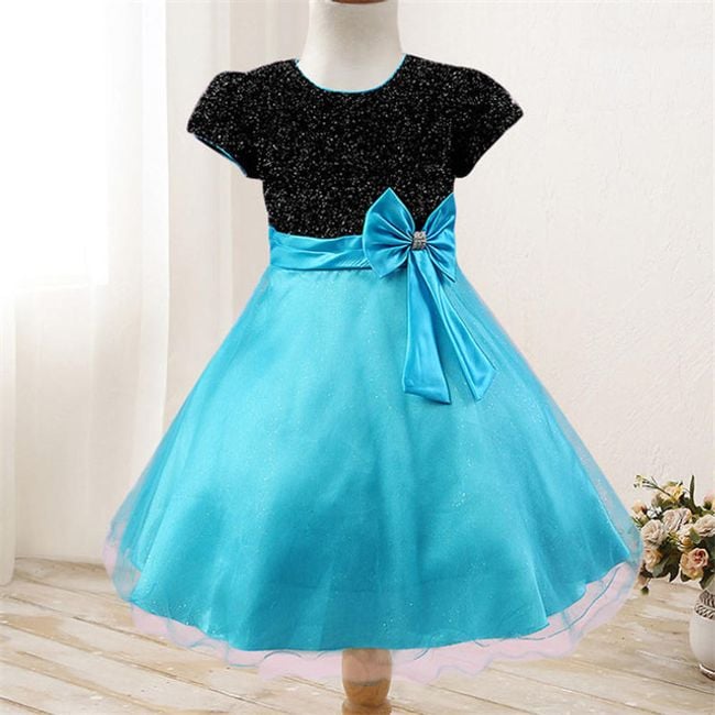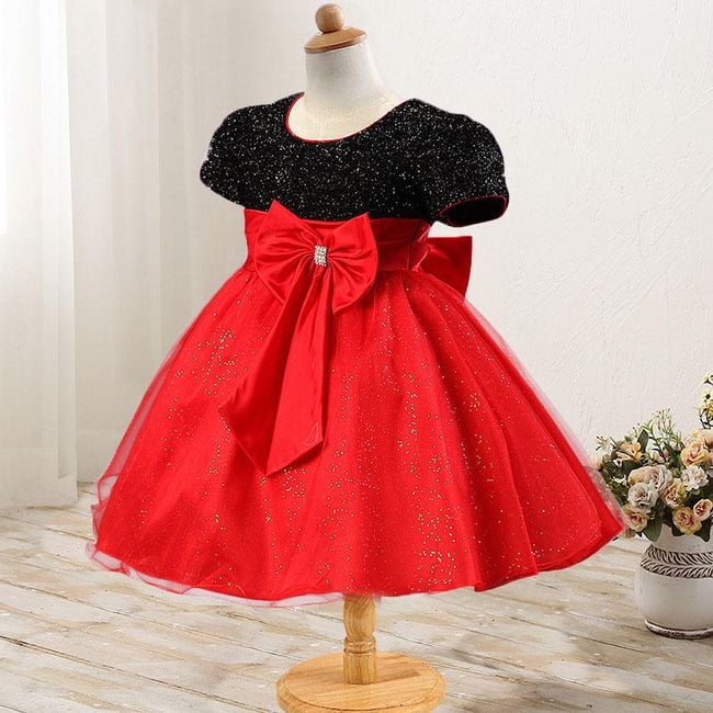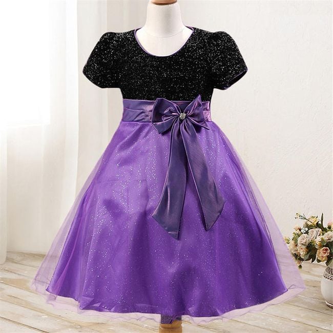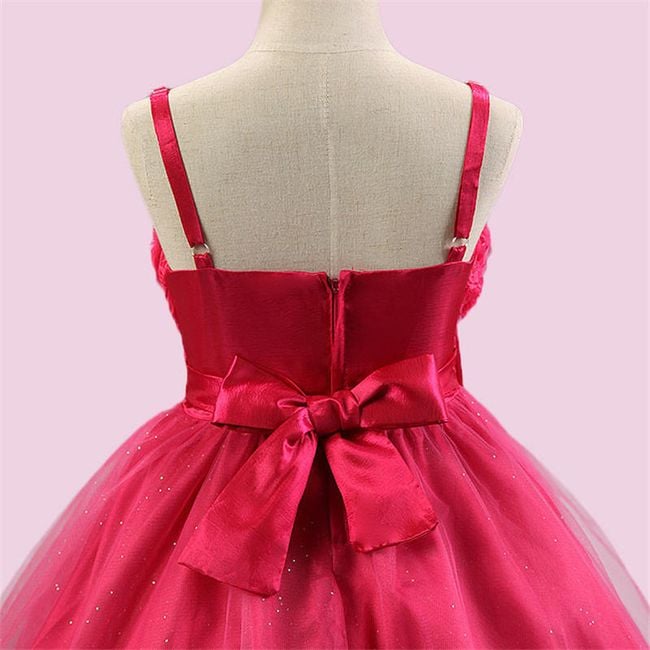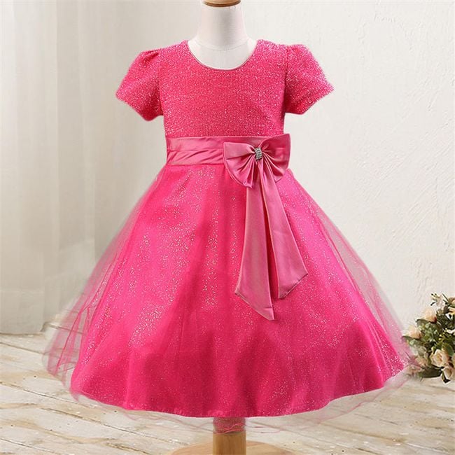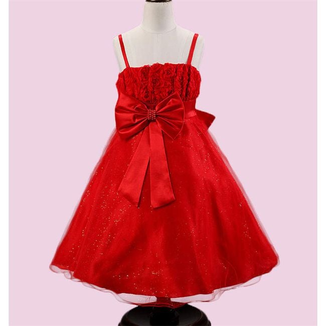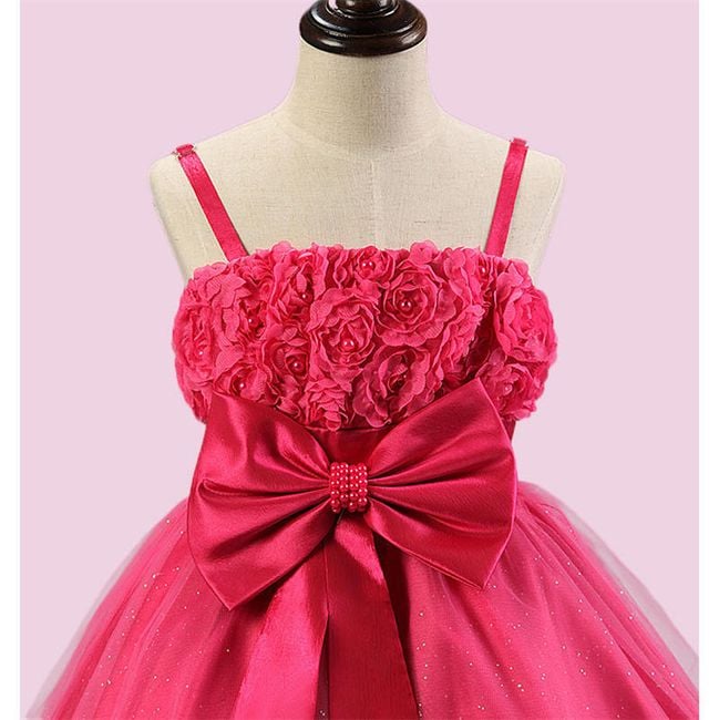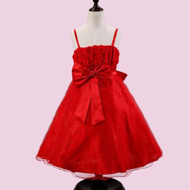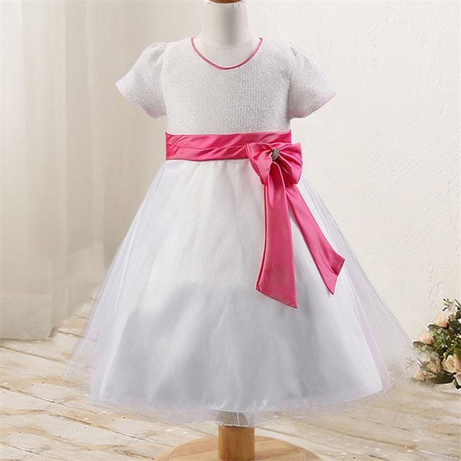 The dress is adorned with a beautiful bow and is suitable for occasions such as weddings.