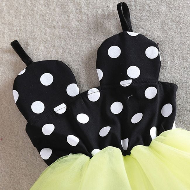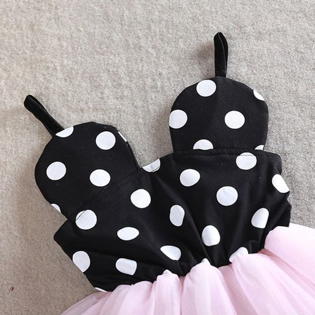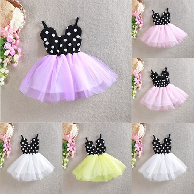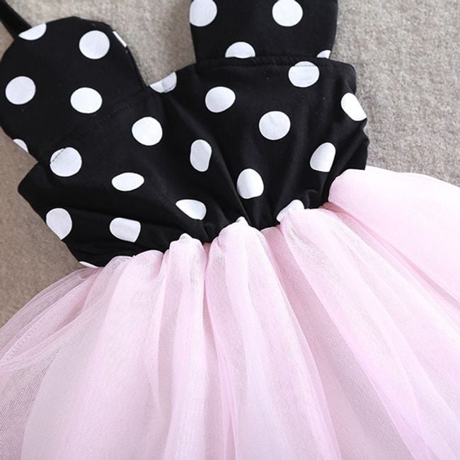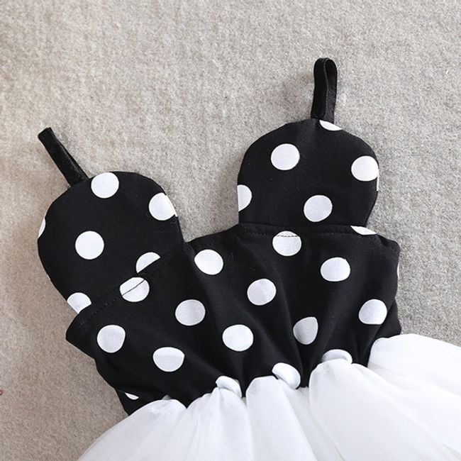 Beautiful little princess dresses are suitable for various festive occasions. The top part of the dress is black with white polka dots, and the bottom part consists of a tulle skirt. You have the option to choose from several colours of the skirt.