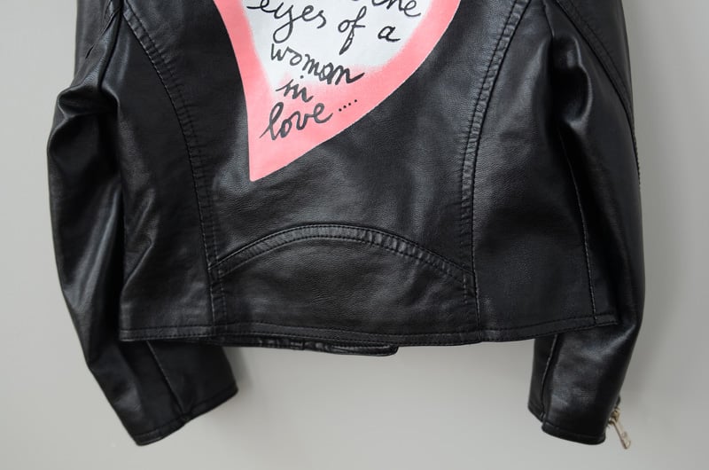 The standout feature of this jacket is the large heart print on the back.