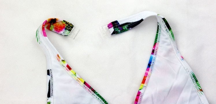 The bikini features a strap on the bottoms and at the bottom of the top.