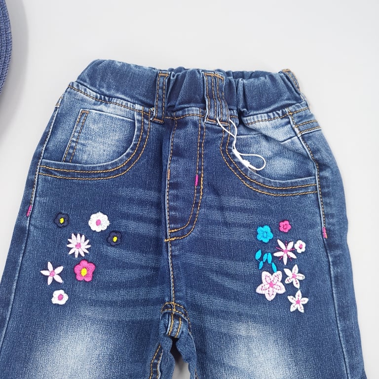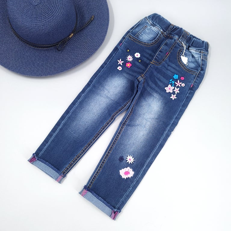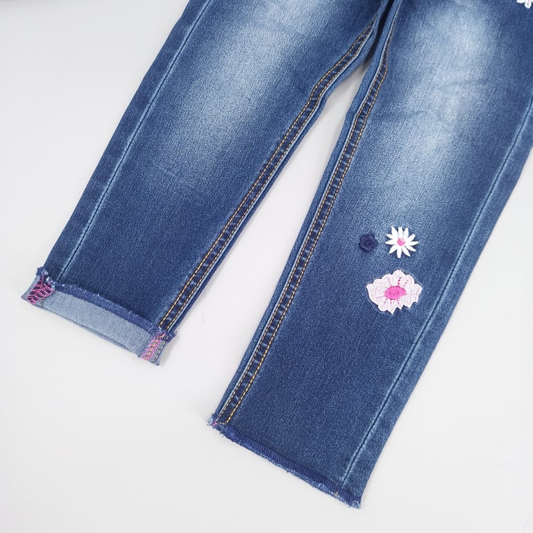 Girl's jeans with a print of small and cute flowers will delight every little princess.