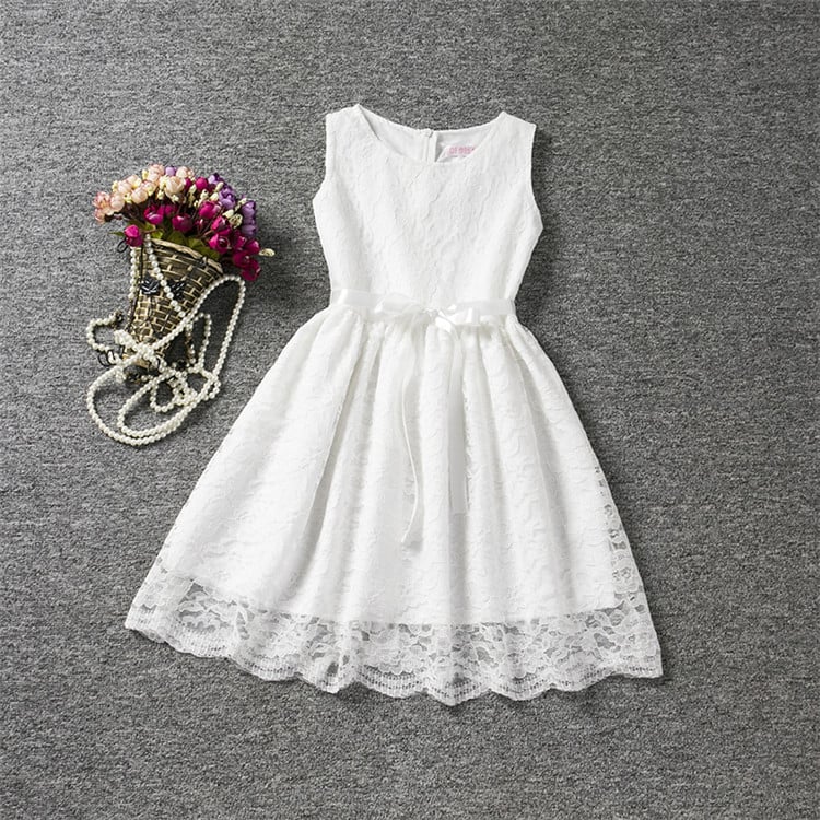 Beautiful girls' lace dress with a belt around the waist, tied into a small bow.