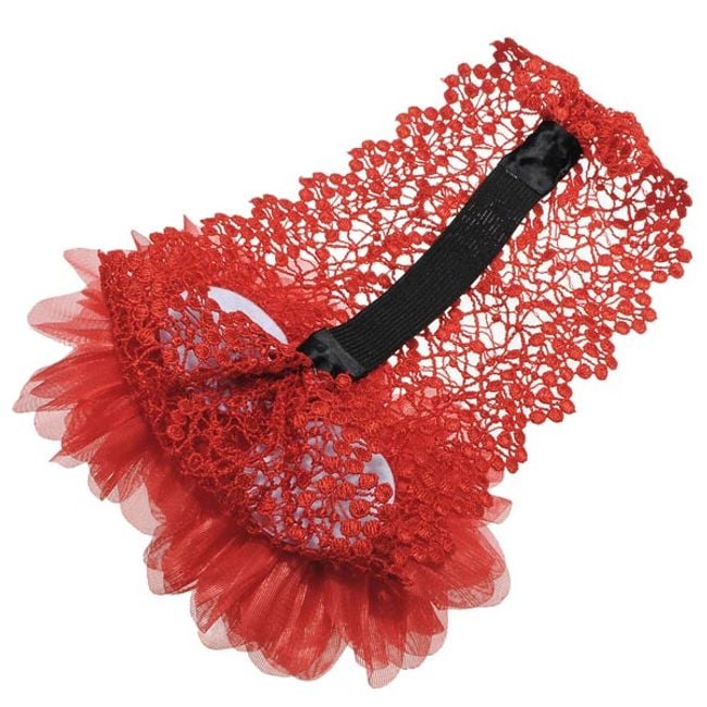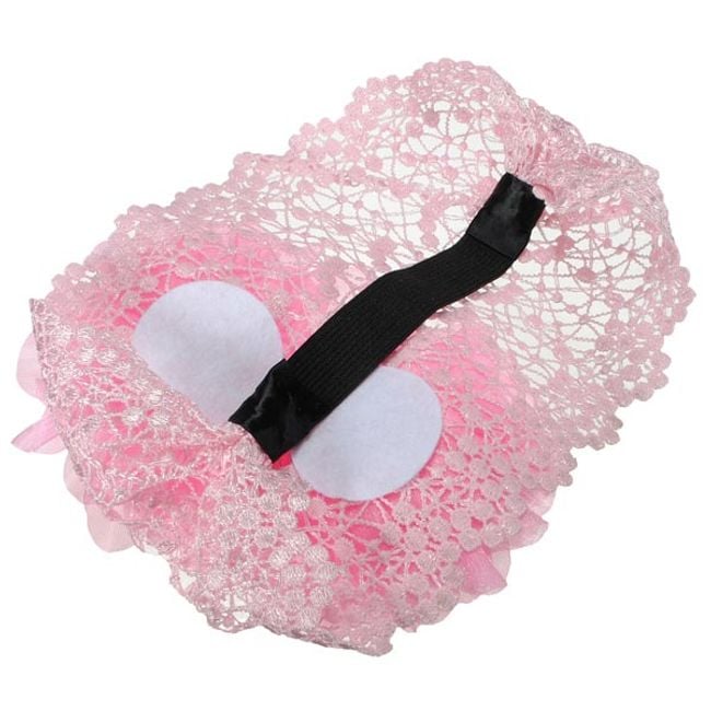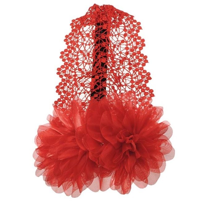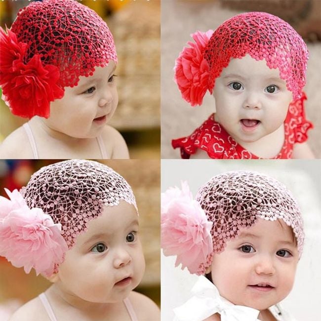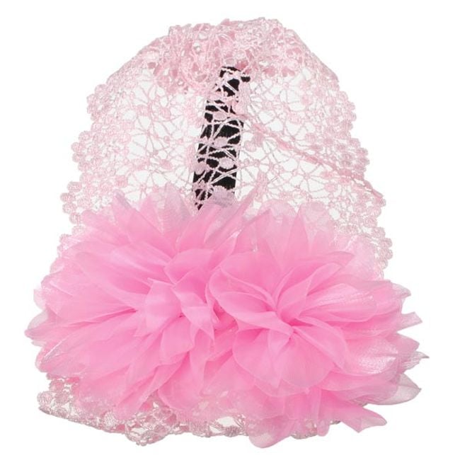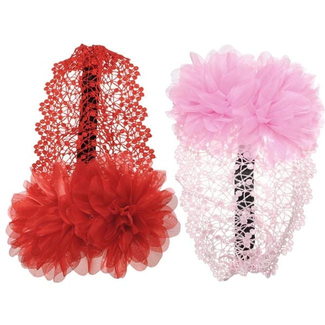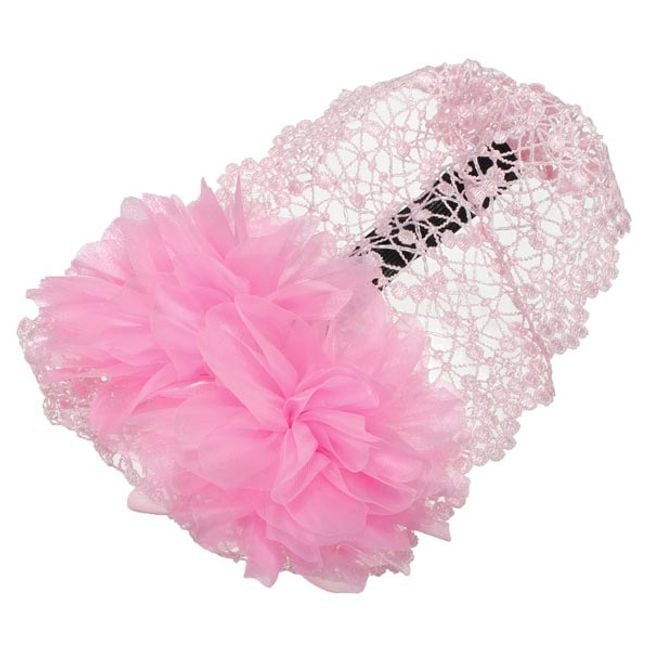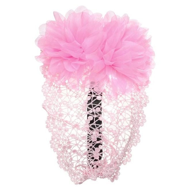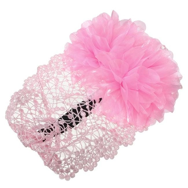 The headband for little girls is made from stretchy lace and elastic. It is adorned with a flower on the side.
