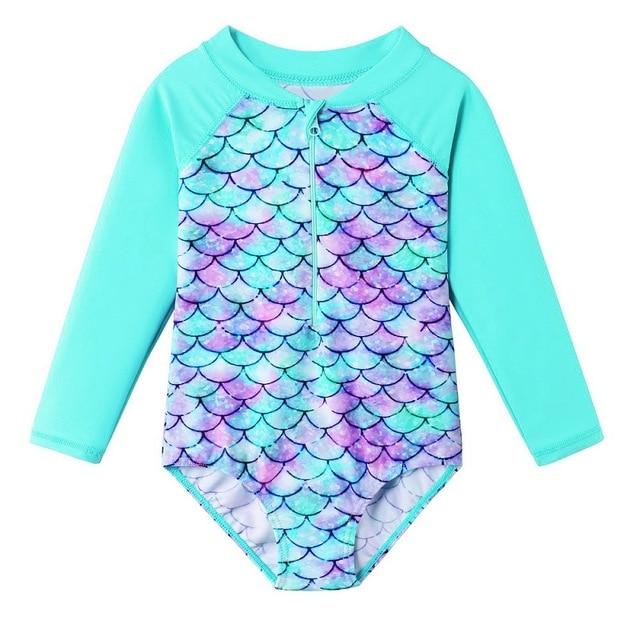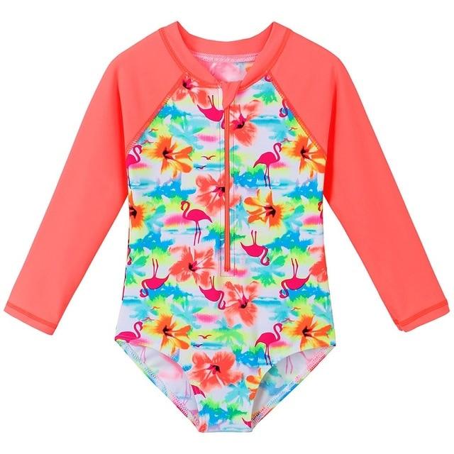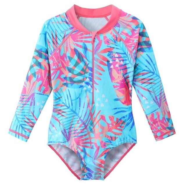 Girls' one-piece swimsuit with long sleeves and zip fastening.