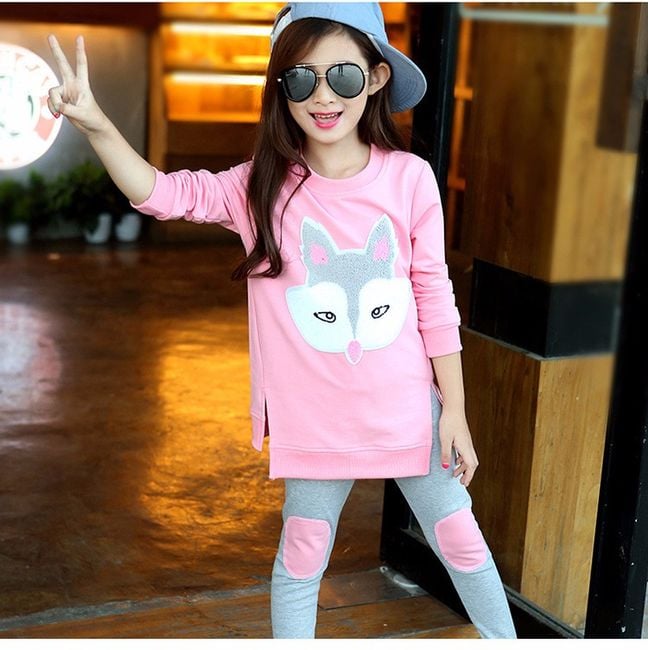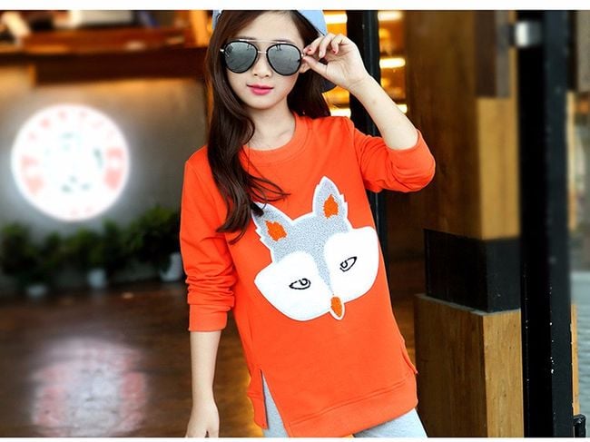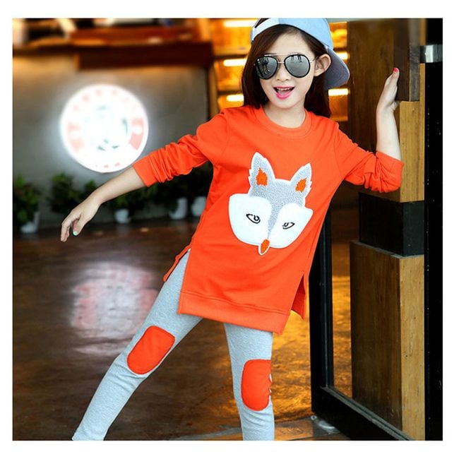 The set consists of a longer sweatshirt and trousers. The sweatshirt features a fox print and the trousers are in a matching colour. Together, the set is very stylish and suitable for the city or school.
