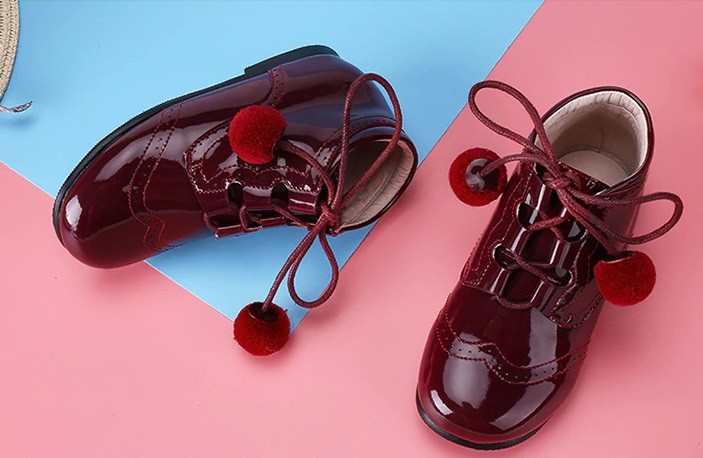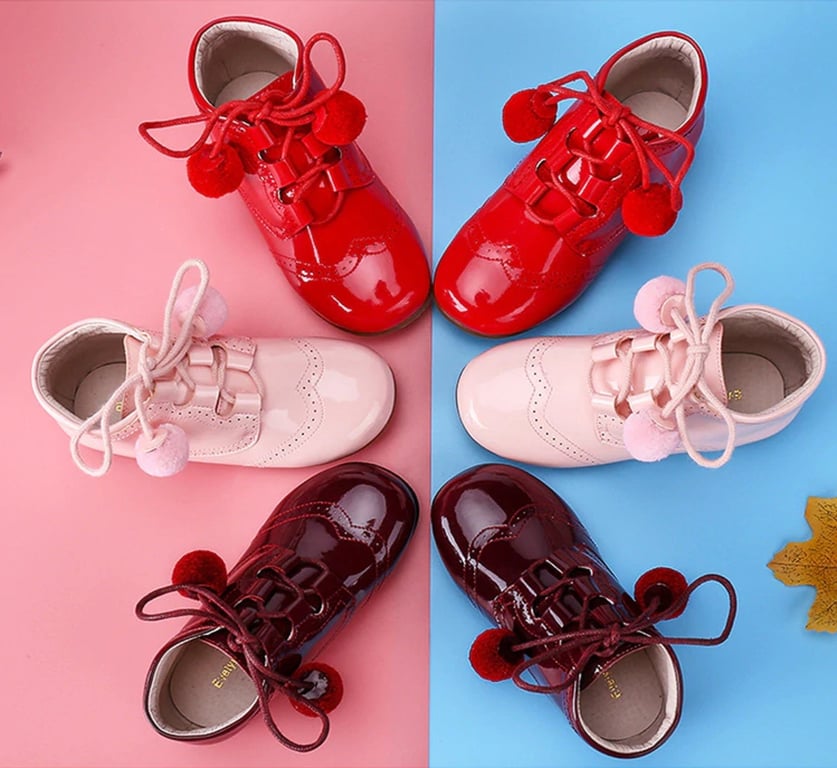 The shoes are fastened with laces, which are adorned with pom-poms at the ends.