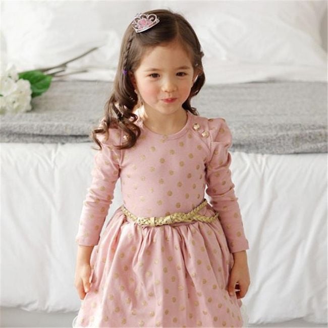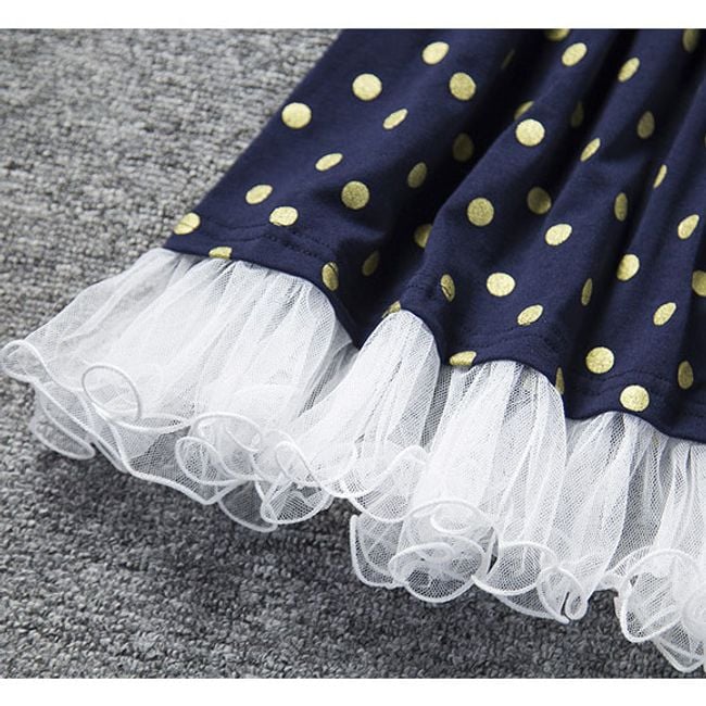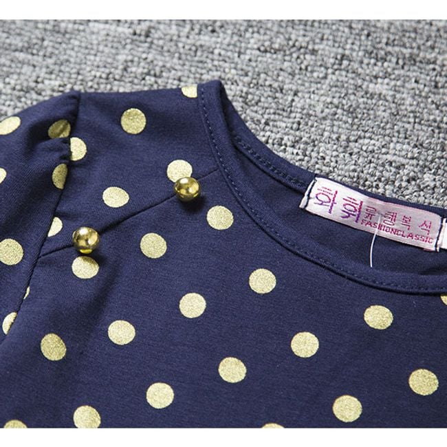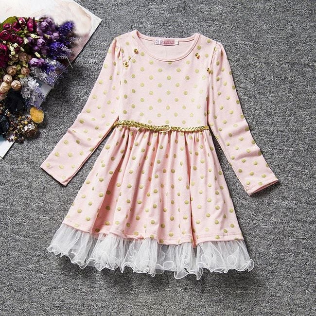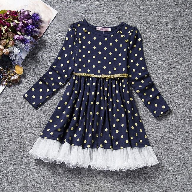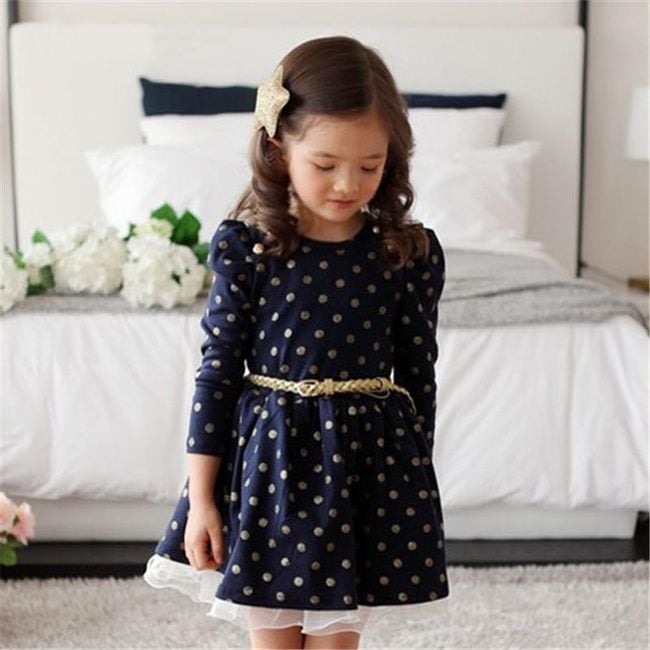 Cute girls' dress with polka dots and a belt. The size chart shows the product measurements, not body measurements.