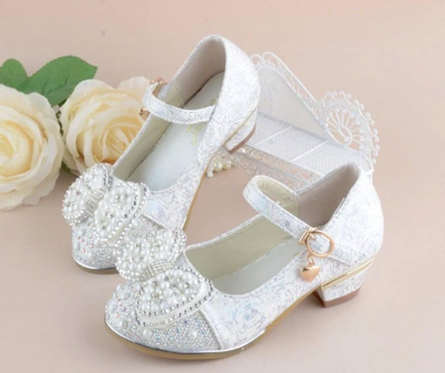These girls' pumps adorned with a bow and pearls are suitable footwear for little bridesmaids.