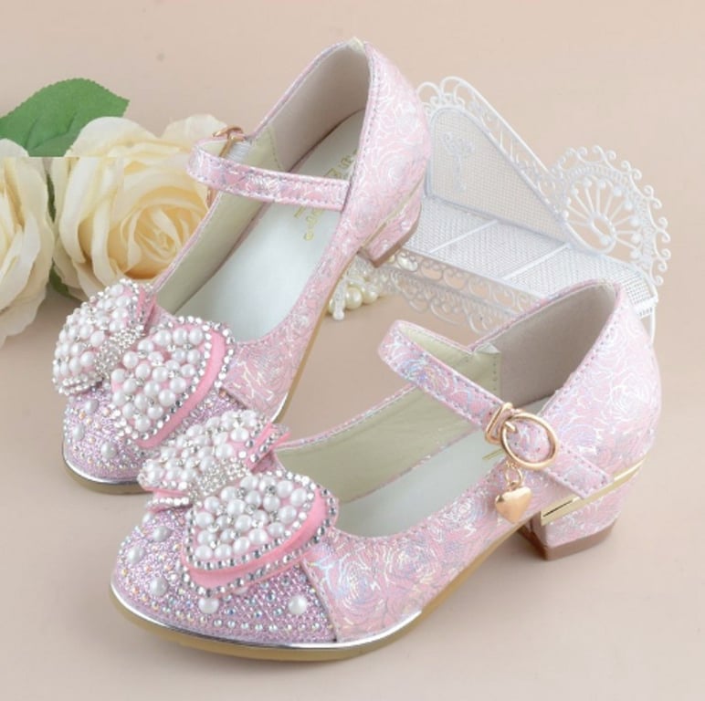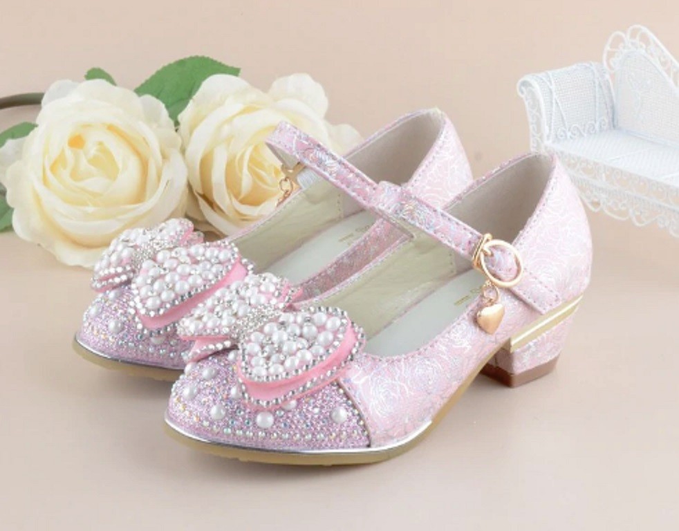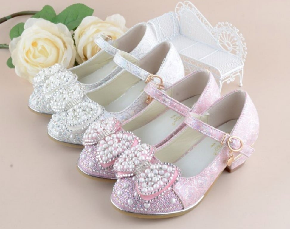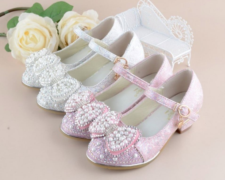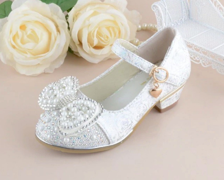 These girls' court shoes adorned with a bow and pearls are suitable footwear for little bridesmaids.