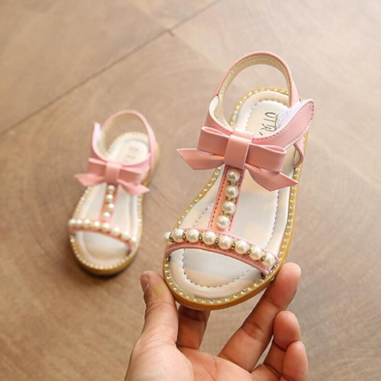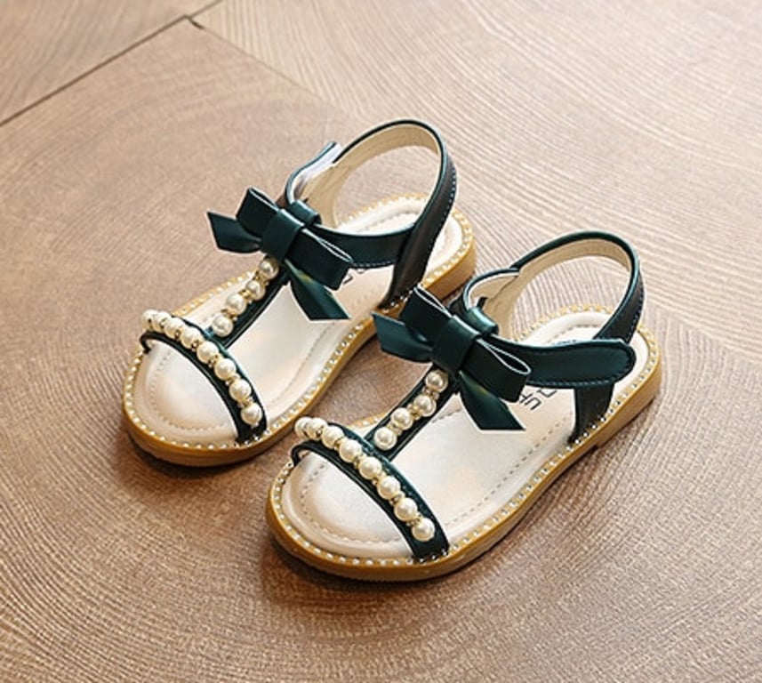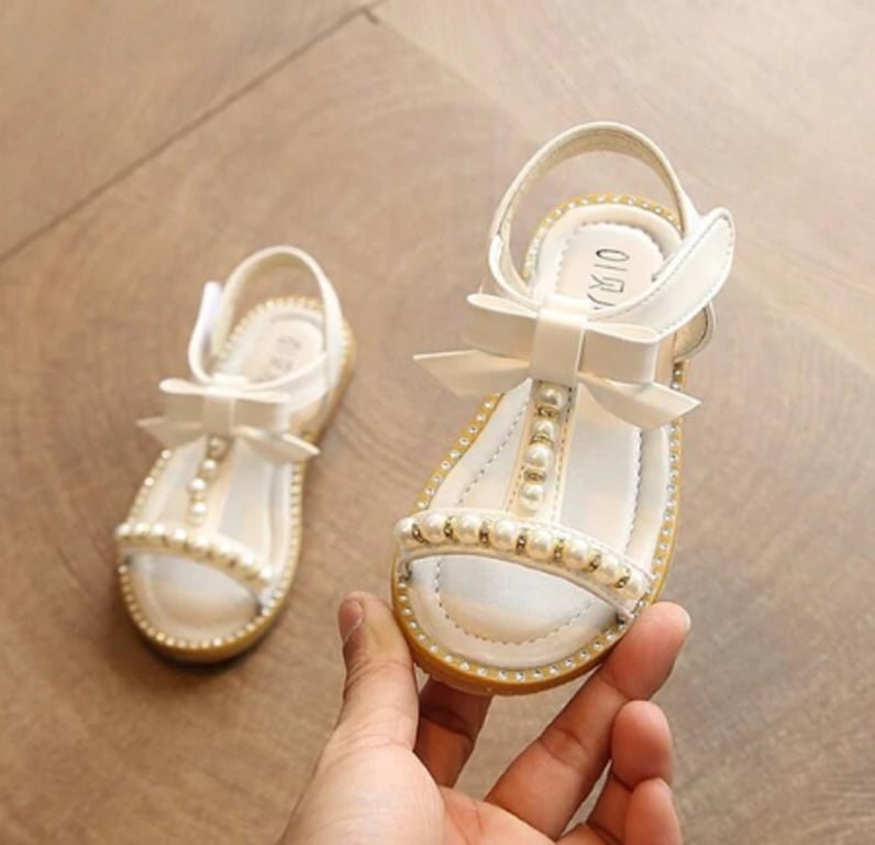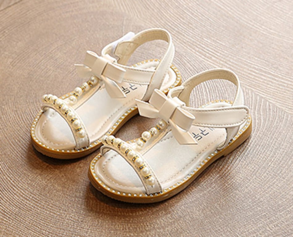 These pearl-decorated sandals with a bow will be a great fashion accessory for a girl's summer outfit.