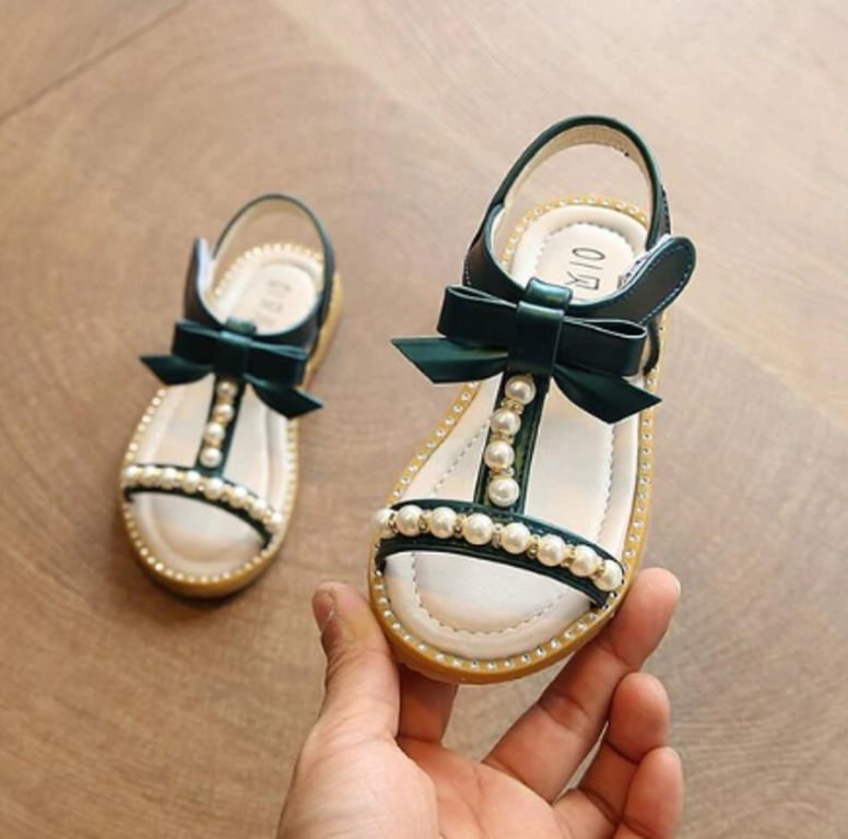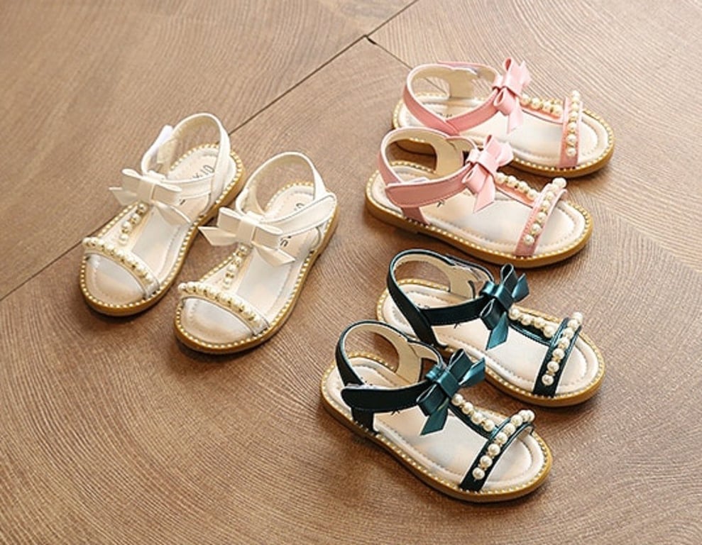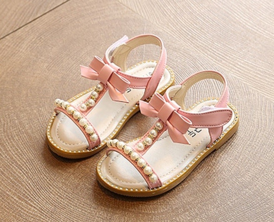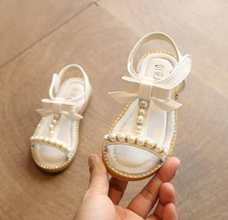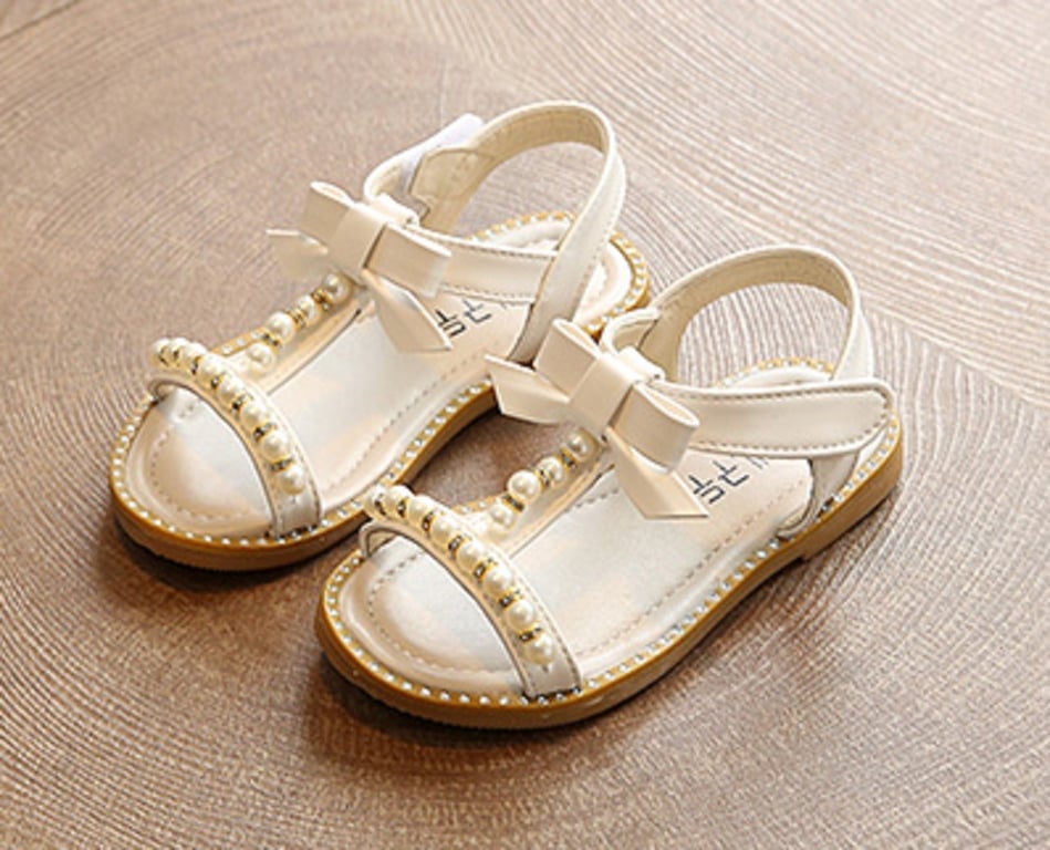 These pearl-adorned sandals with a bow will be a great fashion accessory for a girl's summer outfit.