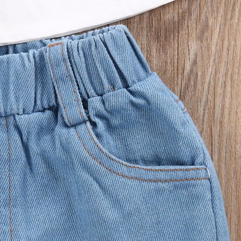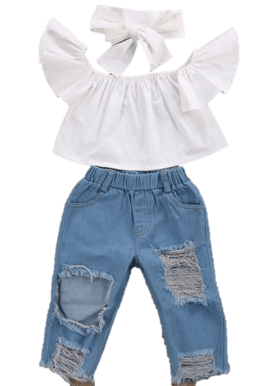 The set consists of a white t-shirt and blue ripped jeans, and it also comes with a fabric headband.