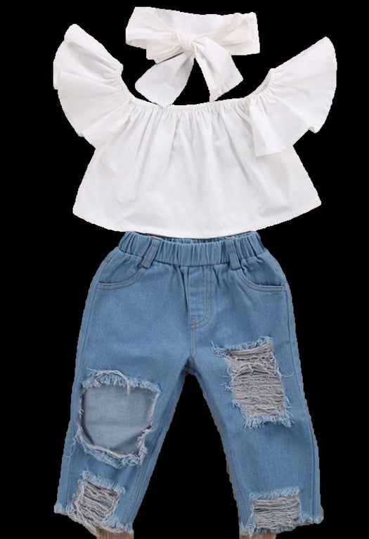 The set consists of a white t-shirt and blue ripped jeans, and it also comes with a fabric headband.