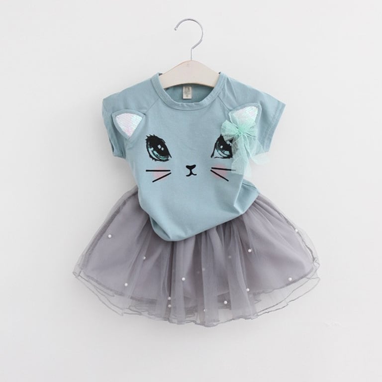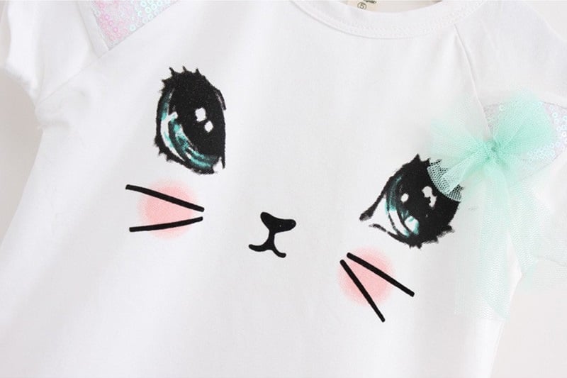 The t-shirt features a kitten's face with a bow across the entire shirt, and the skirt is trimmed with glitter.