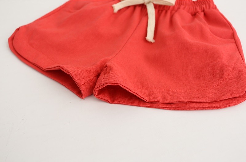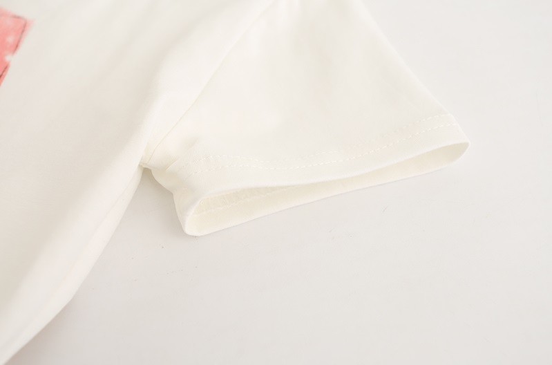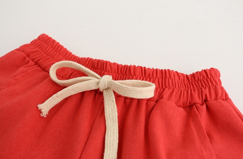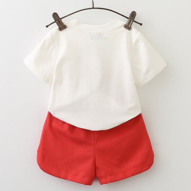 The set consists of a white t-shirt with a melon and red shorts with drawstrings.