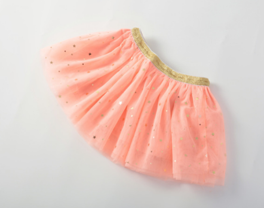Beautiful girls' skirt with several sparkling stars and a gold stripe at the waist.