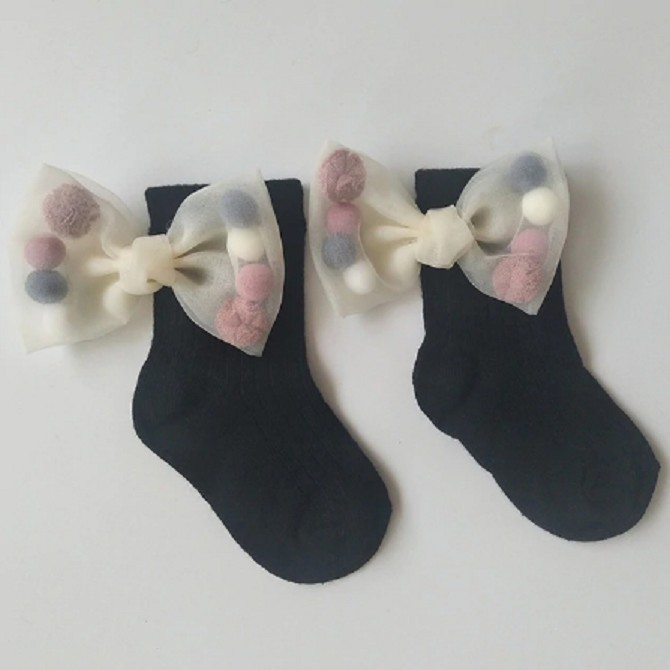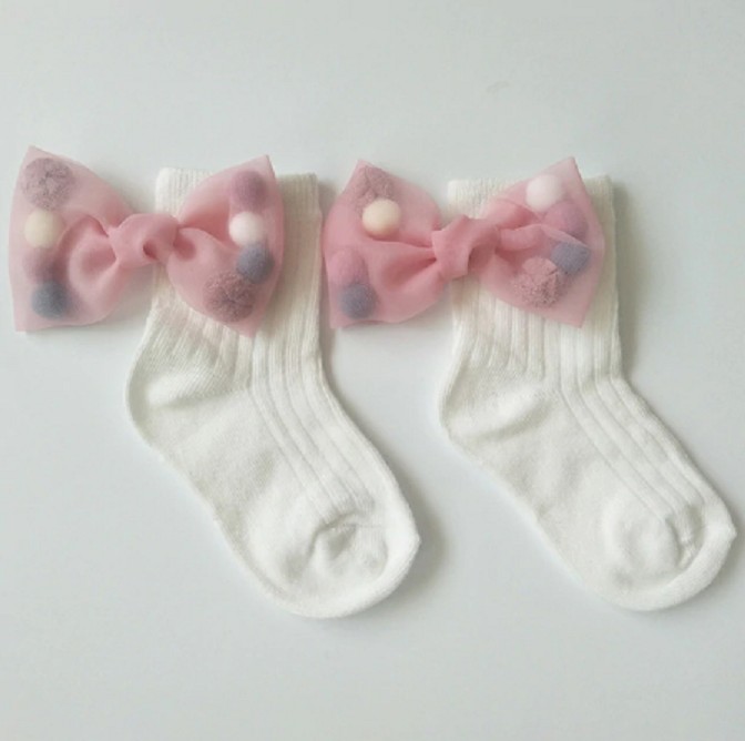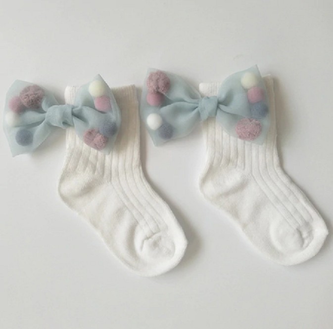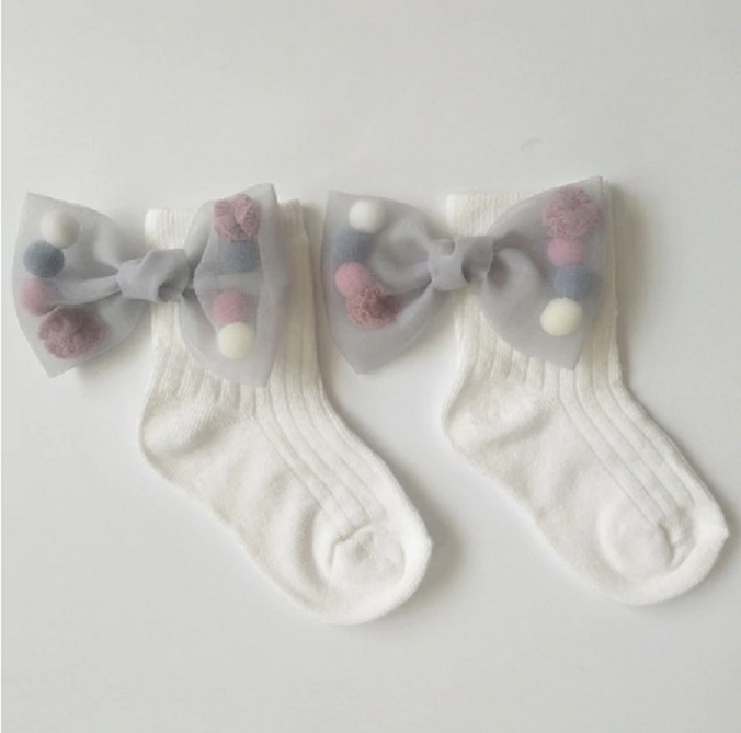 The socks are ankle-length. The bow is adorned with pom-poms.