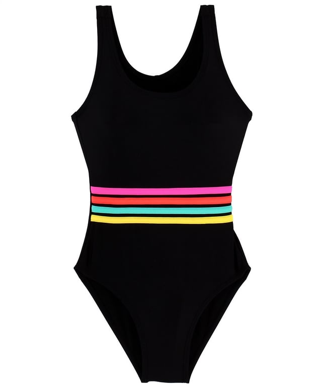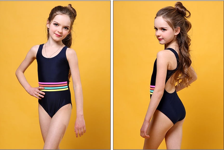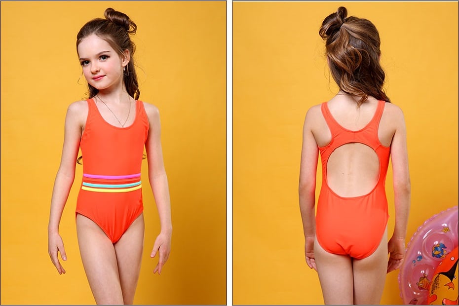 Beautiful girls' swimsuit with a hole in the back and decorative stripes at the waist.