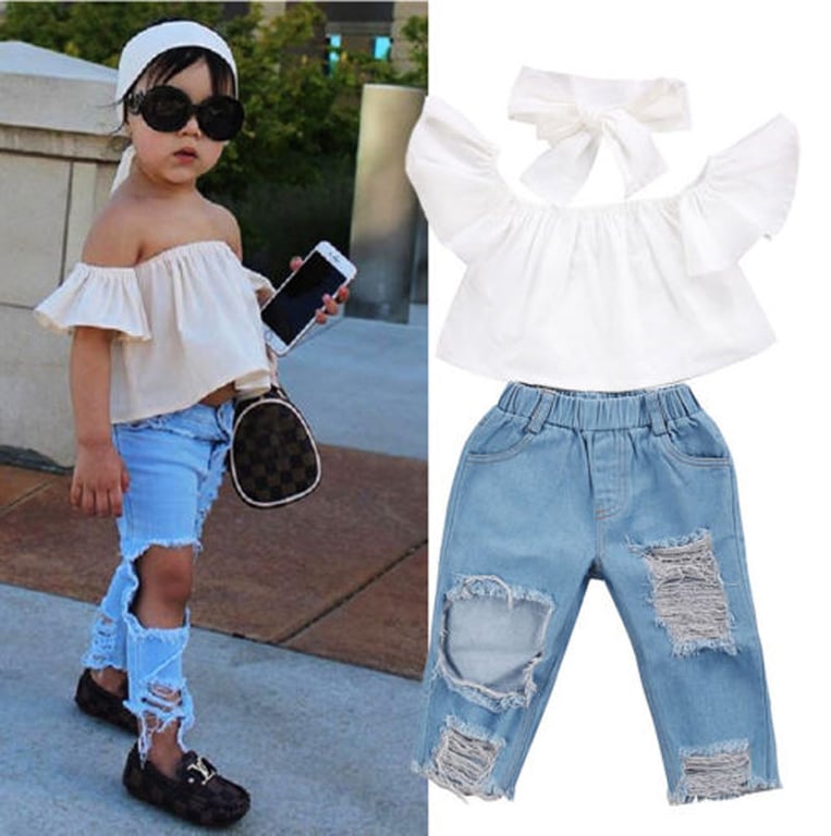 A children's clothing set that includes a white top, a matching bow headband, and ripped jeans.