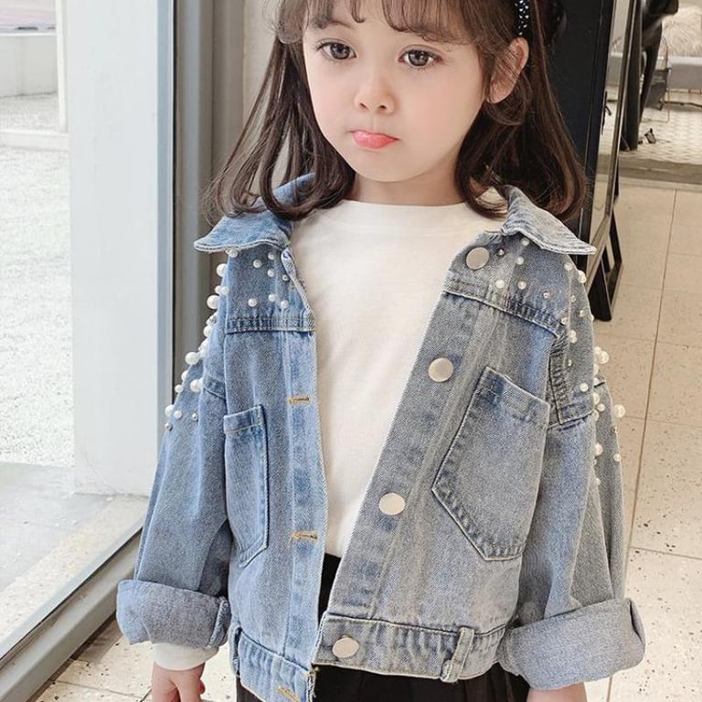 Tags: girls' jacket, girls' denim jacket, decorated jacket, pearls, jacket, stylish jacket, children's clothing, girls' clothing, fashion