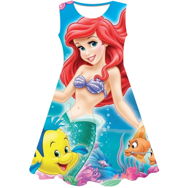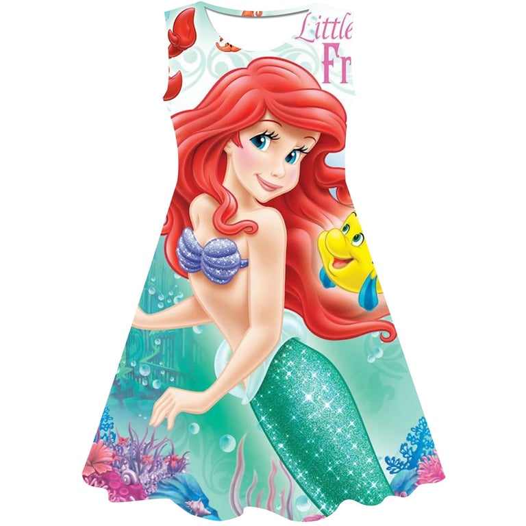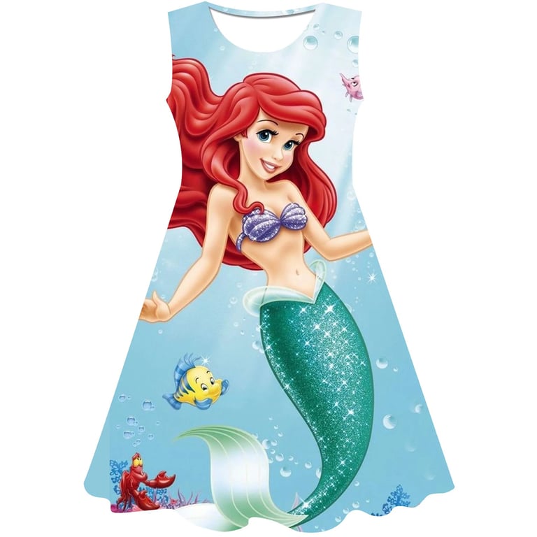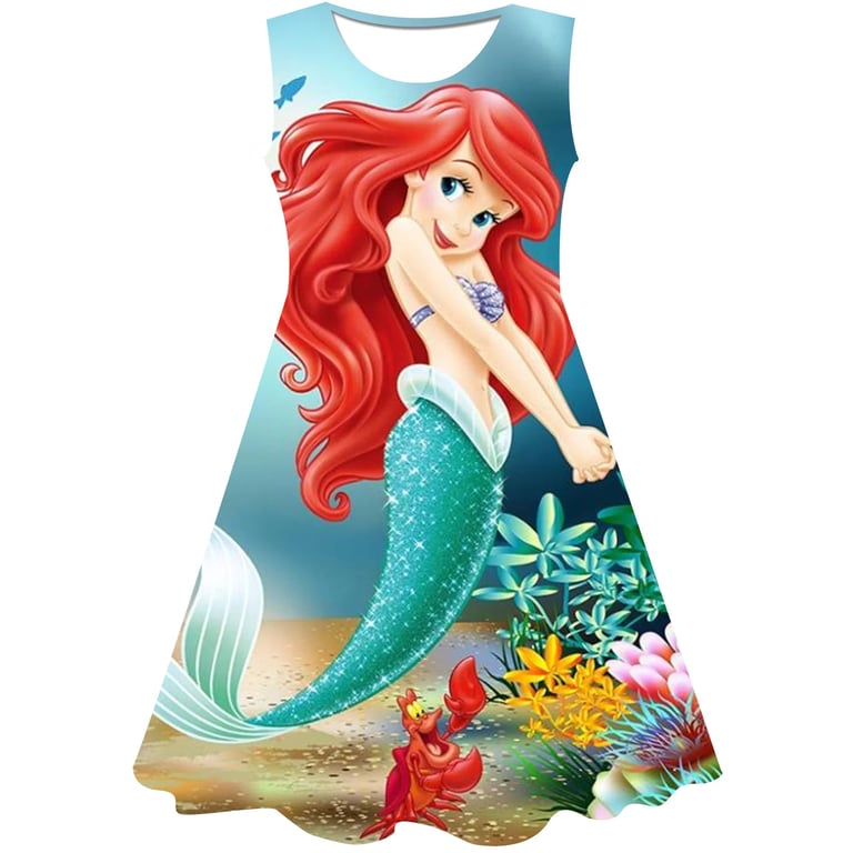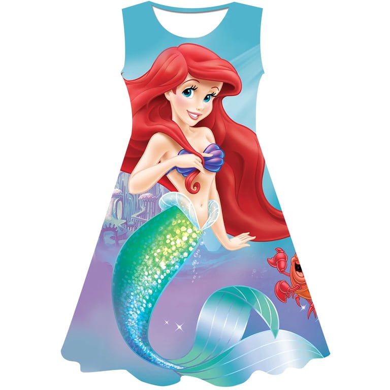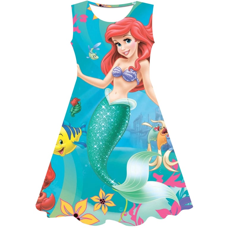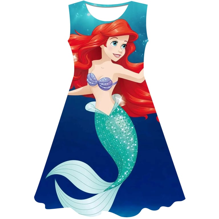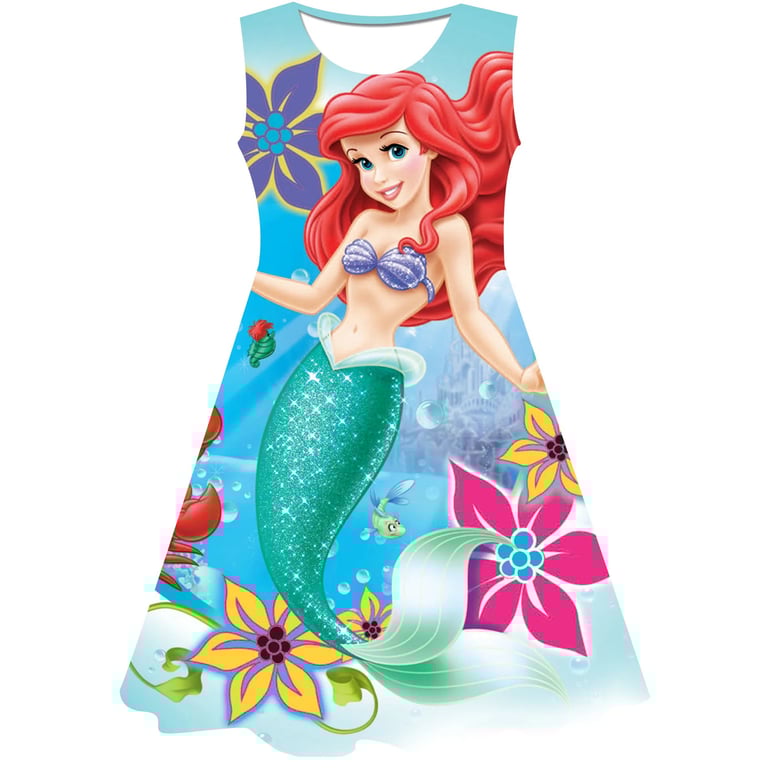 Girls' summer dress: The Little Mermaid. Material: 70% cotton, 15% polyester, 15% spandex Size chart (cm) Size 90: Dress length 54 cm; Bust circumference 52 cm; Height 85–95 cm Size 100: Dress length 58 cm; Bust circumference 54 cm; Height 95–105 cm Size 110: Dress length 59 cm; Bust circumference 58 cm; Height 105–115 cm Size 120: Dress length 62 cm; Bust circumference 60 cm; Height 115–125 cm Size 130: Dress length 62 cm; Bust circumference 64 cm; Height 125–135 cm