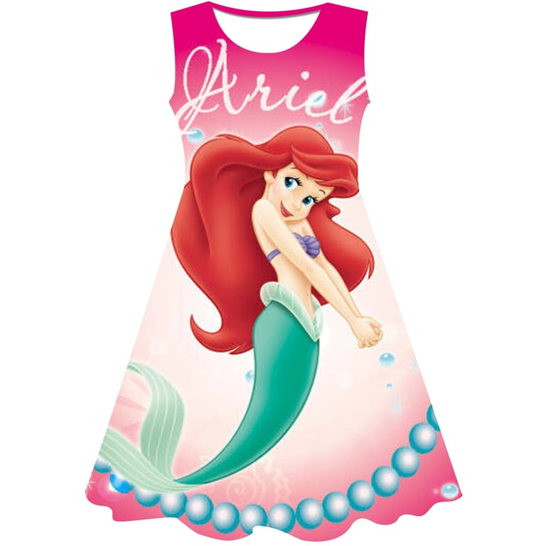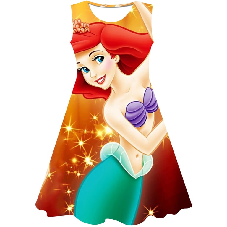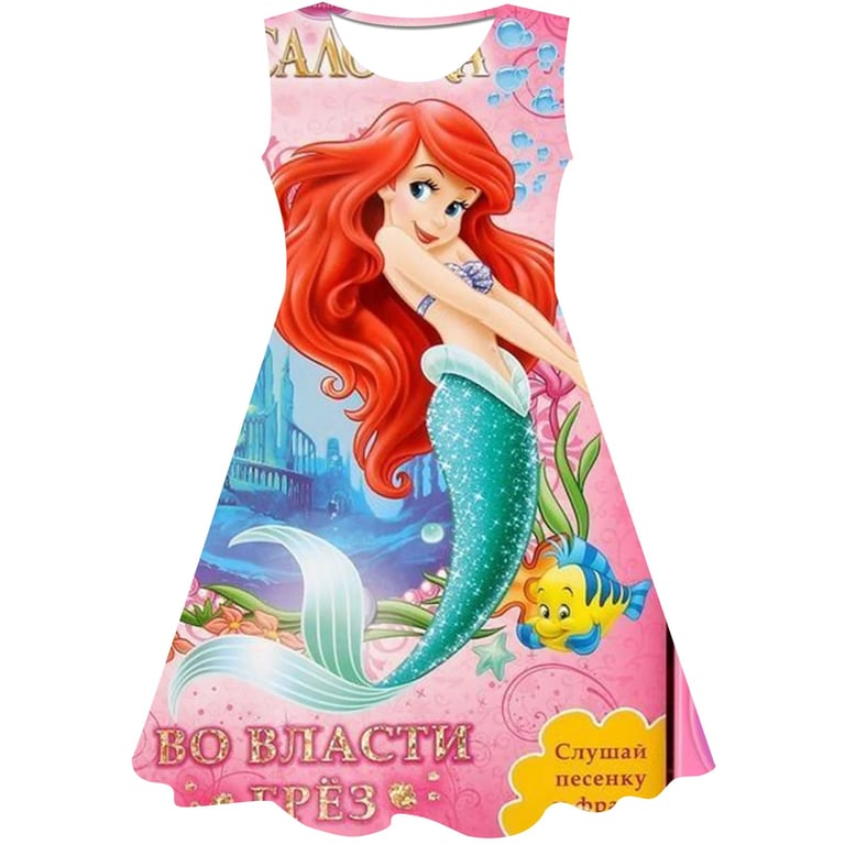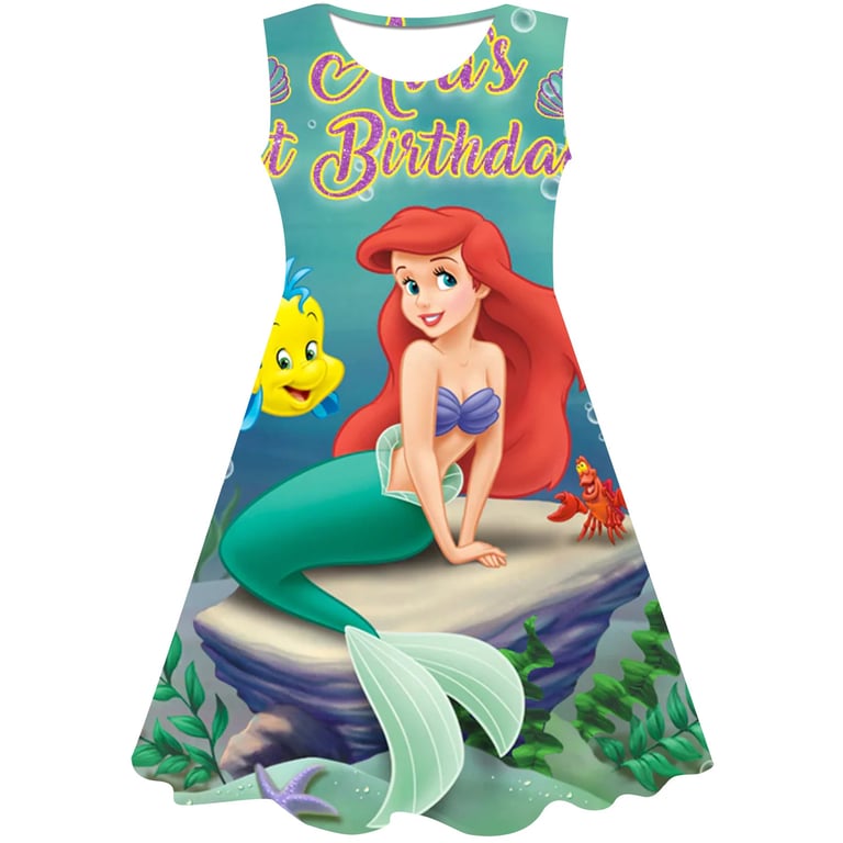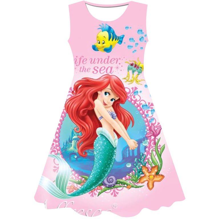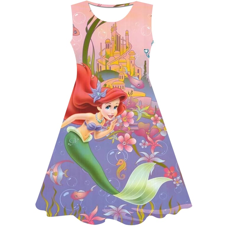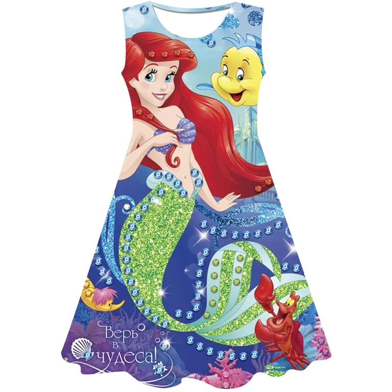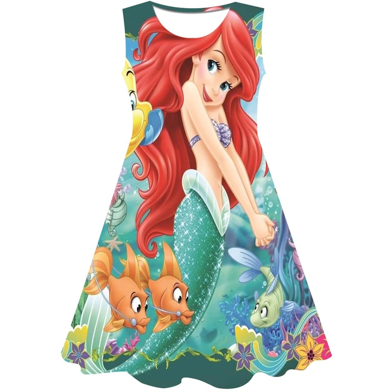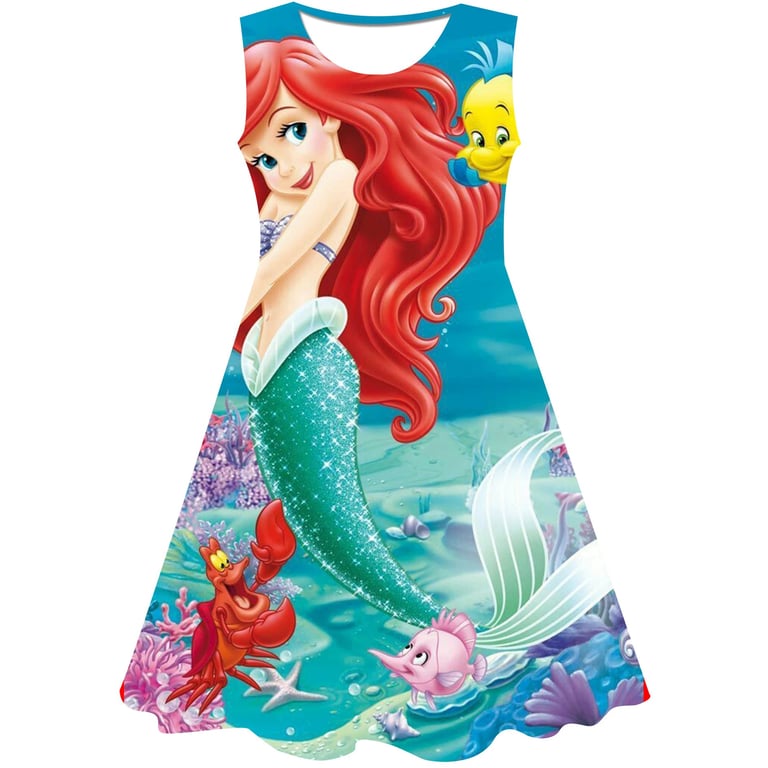 Girls' summer dress: The Little Mermaid. Material: 70% cotton, 15% polyester, 15% spandex Size chart (cm) Size 90: Dress length 54 cm; Bust circumference 52 cm; Height 85–95 cm Size 100: Dress length 58 cm; Bust circumference 54 cm; Height 95–105 cm Size 110: Dress length 59 cm; Bust circumference 58 cm; Height 105–115 cm Size 120: Dress length 62 cm; Bust circumference 60 cm; Height 115–125 cm Size 130: Dress length 62 cm; Bust circumference 64 cm; Height 125–135 cm