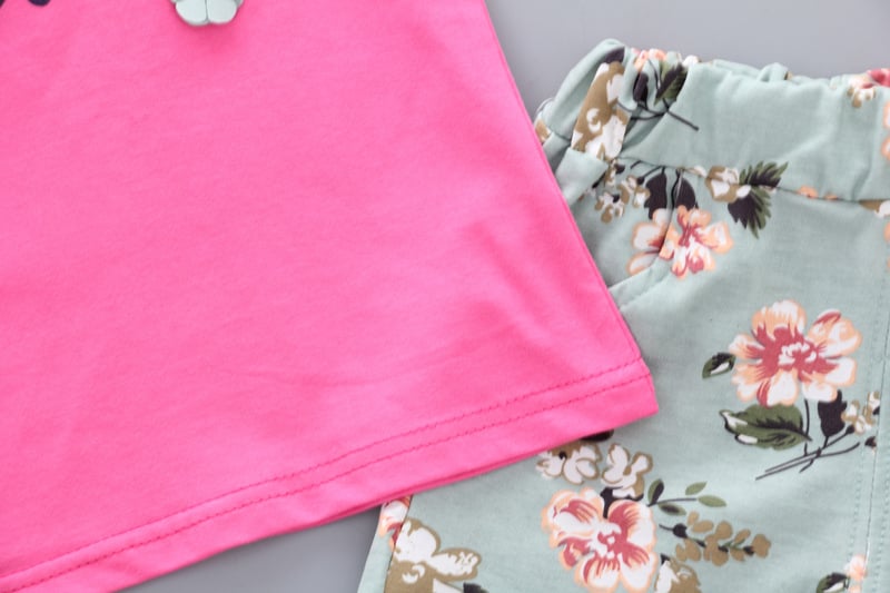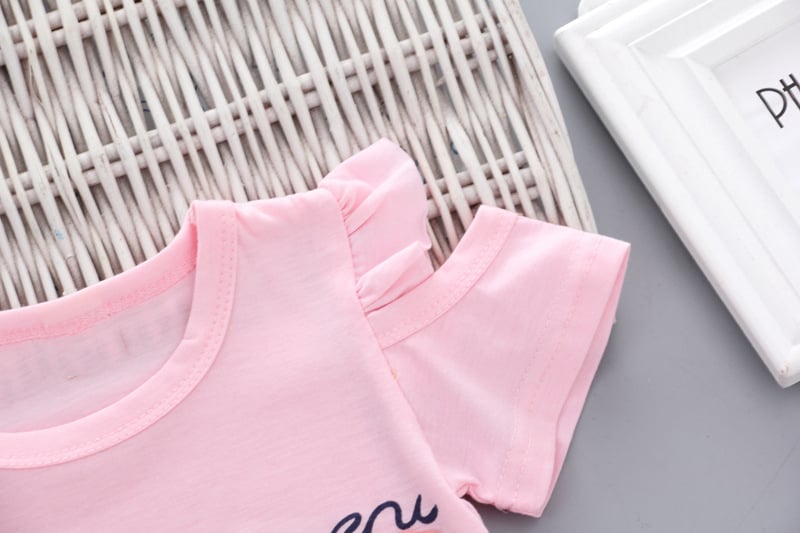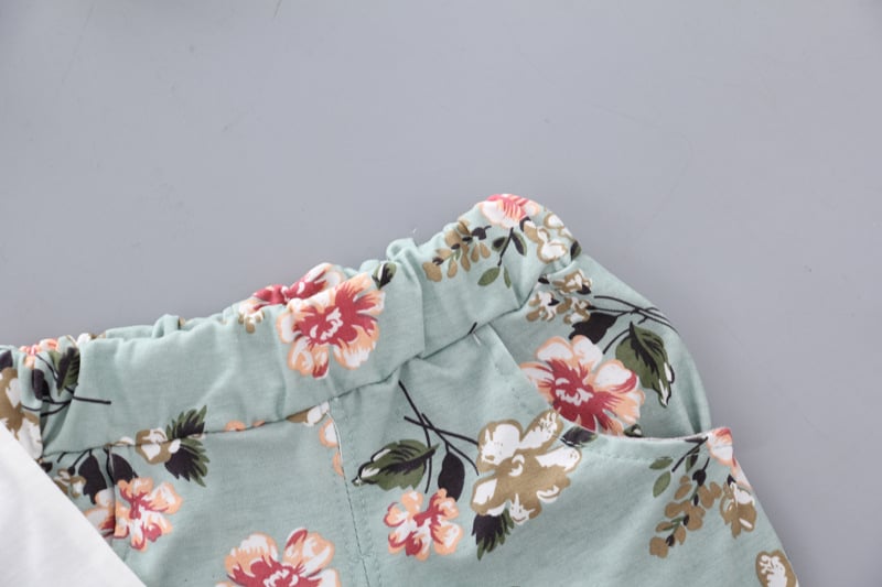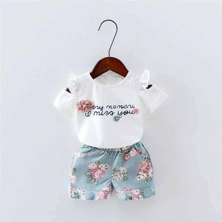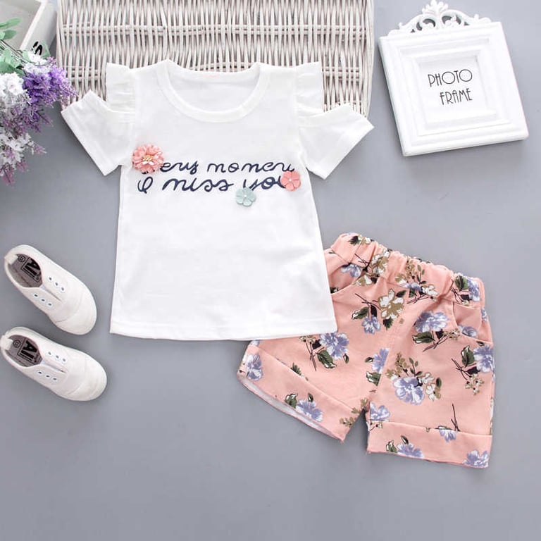 Tags: girls' set, girls' clothing, girls' shorts, shorts, girls' top, short-sleeve top, children, children's fashion, ruffles, shoulder cut-outs, fashion, summer set