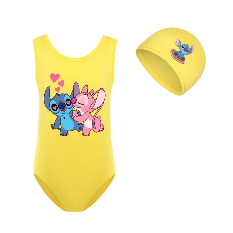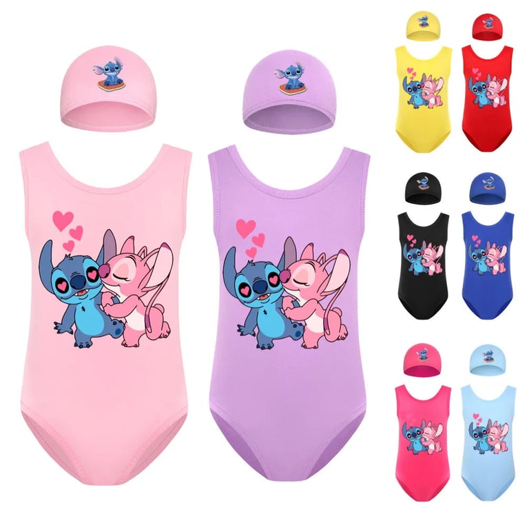 Girls' swimsuit and Stitch cap. Material: 100% polyester Size chart (cm) Size | Swimsuit length | Bust circumference | Recommended age 100 | 51 | 56 | 2-3 years 110 | 53 | 58 | 3-4 years 120 | 55 | 60 | 5-6 years 130 | 57 | 62 | 7-8 years 140 | 59 | 64 | 9-10 years 150 | 61 | 66 | 11-12 years 160 | 63 | 68 | 13-14 years