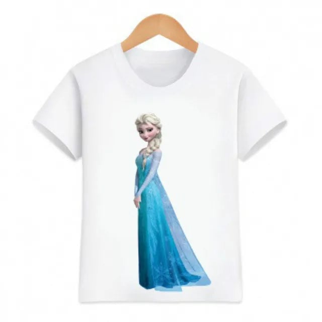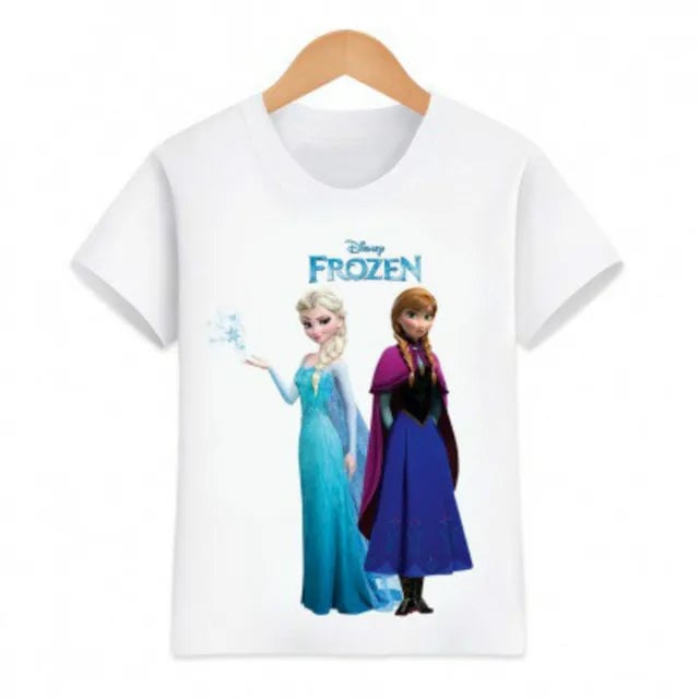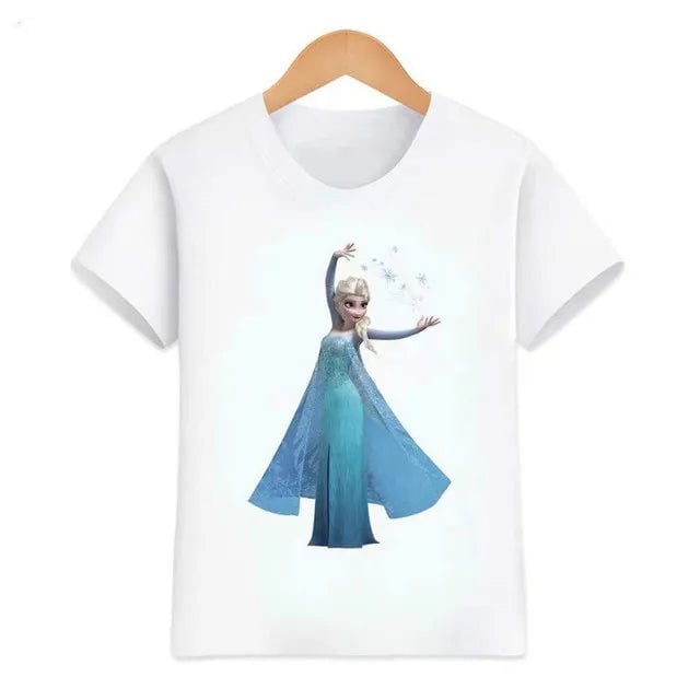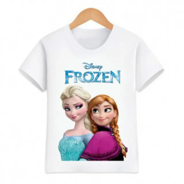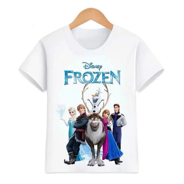 Girls' Frozen T-shirt. Material: 70% polyester, 30% cotton Size chart (cm) Size | T-shirt length | Chest circumference 90 | 38 | 56 100 | 40 | 58 110 | 43 | 60 120 | 46 | 66 130 | 47 | 70 140 | 49 | 72 150 | 51 | 76 160 | 53 | 80
