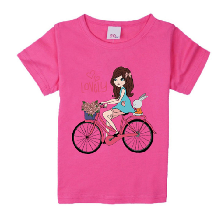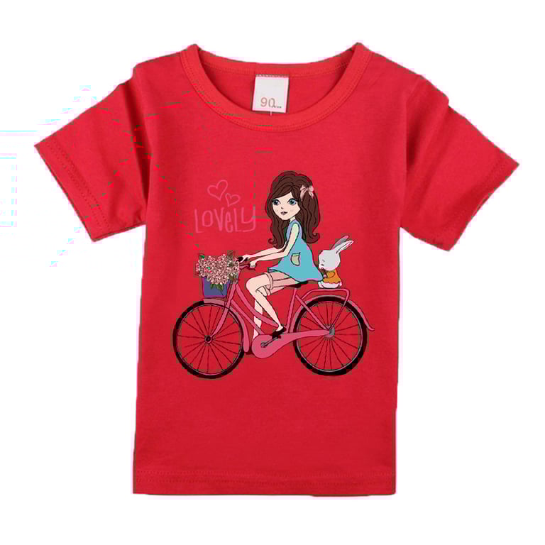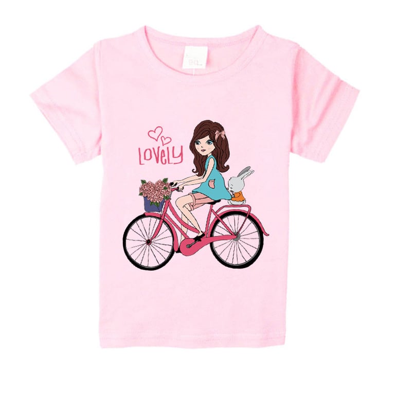 Beautiful girls' t-shirt featuring a girl riding a bike, with flowers in the basket at the front and a cute bunny at the back.
