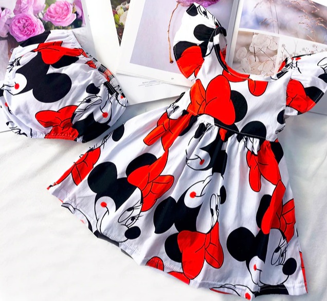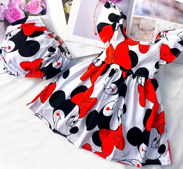 Girls' trendy dress featuring Mickey and Minnie with short sleeves