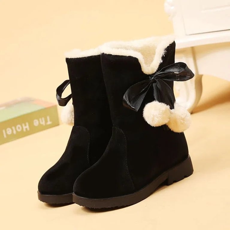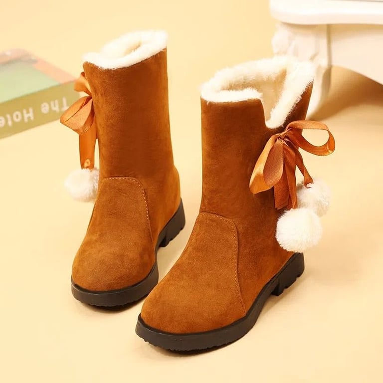 • Girls' slip-on boots with warm plush and a cute tie-up pom-pom.