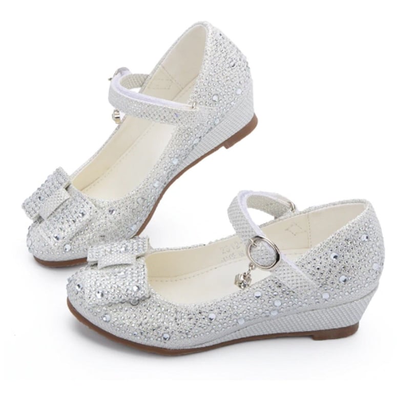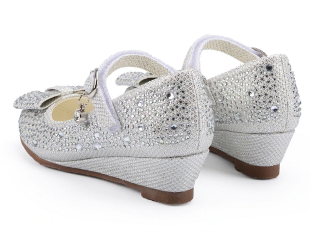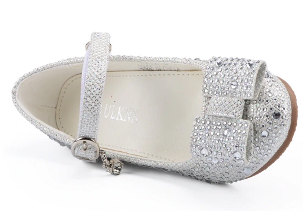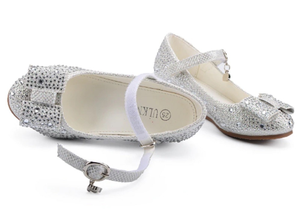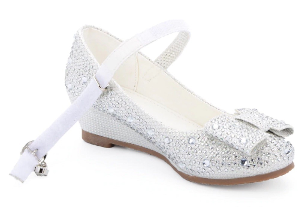 The flats are decorated with gems and feature a Velcro strap across the instep.