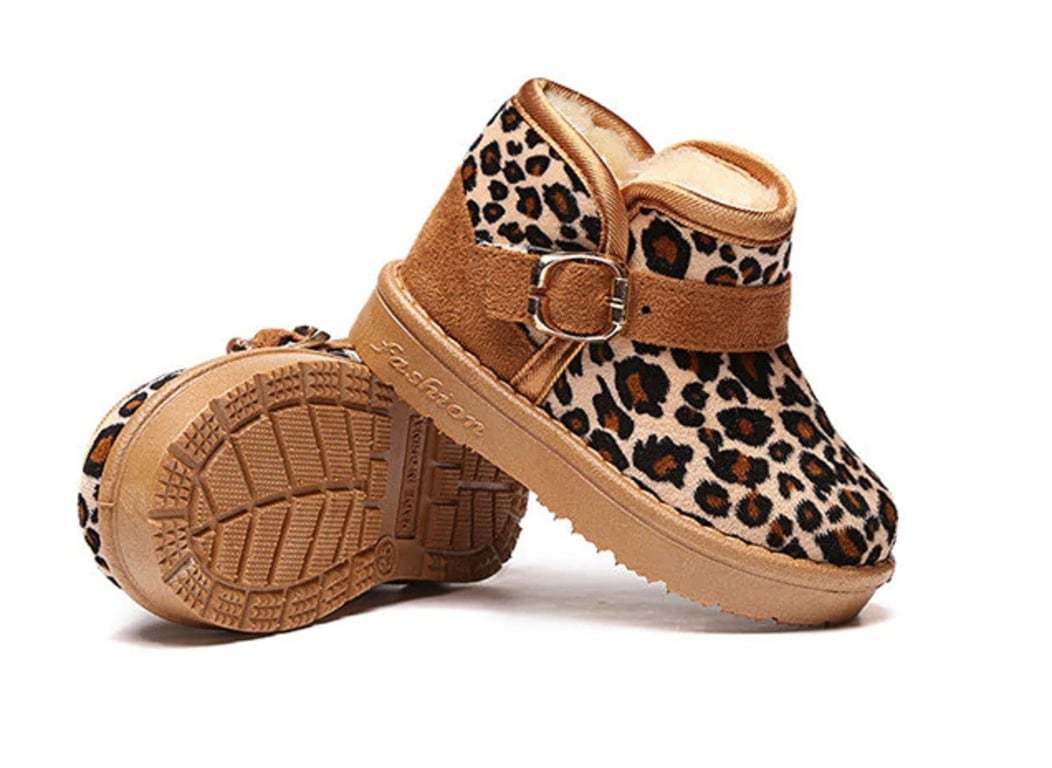 The boots feature a leopard print and have warm plush lining inside.