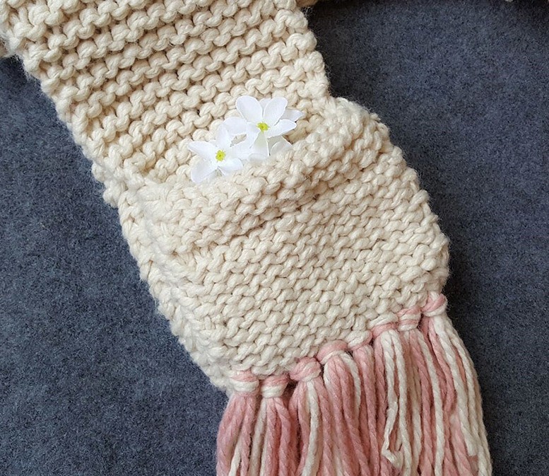 This unique hat with a scarf will keep your little girl's head, neck, and hands warm.