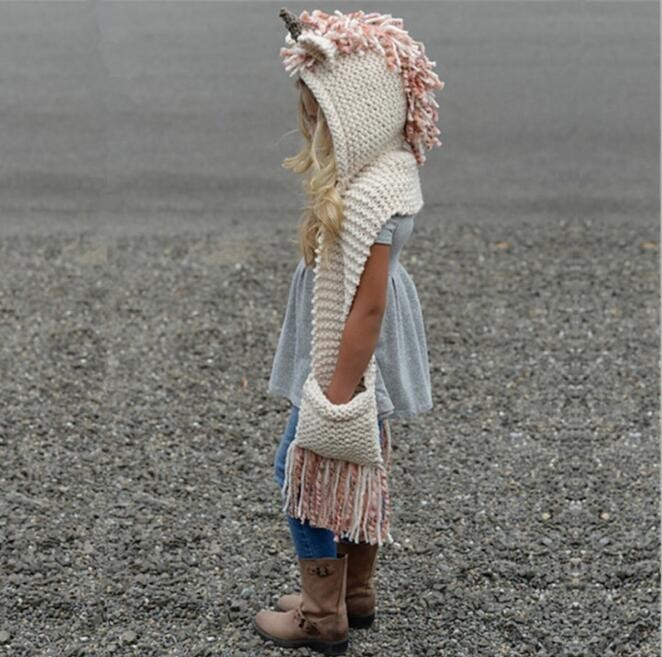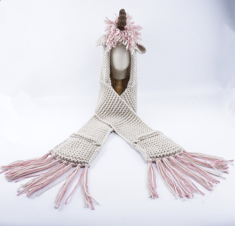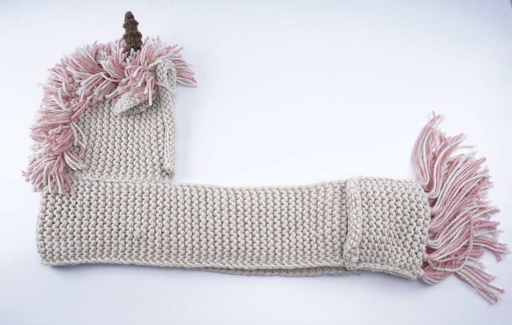 The scarf is designed in the style of a unicorn, featuring a horn, mane, and ears.