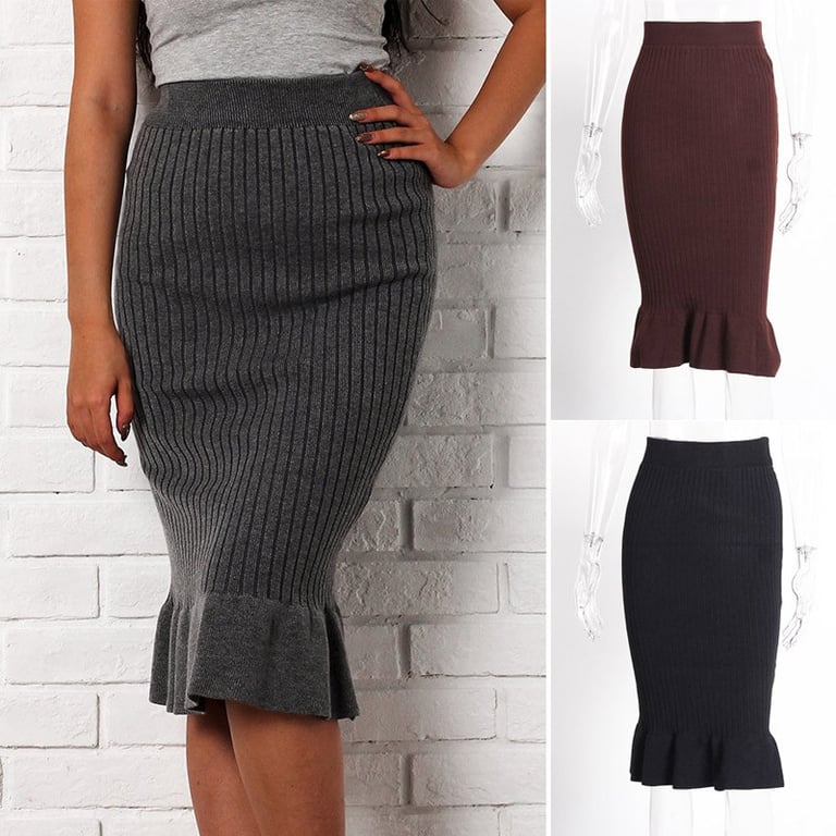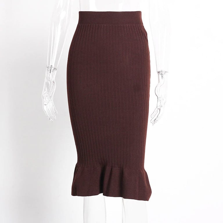 Women's ribbed pencil skirt with knee-length and high waist. The bottom of the skirt is trimmed with a ruffle. One size fits all.