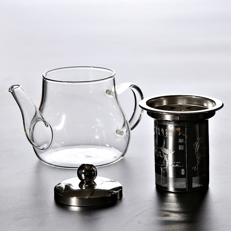 Teapot with a stainless steel filter adorned with a traditional Chinese motif.