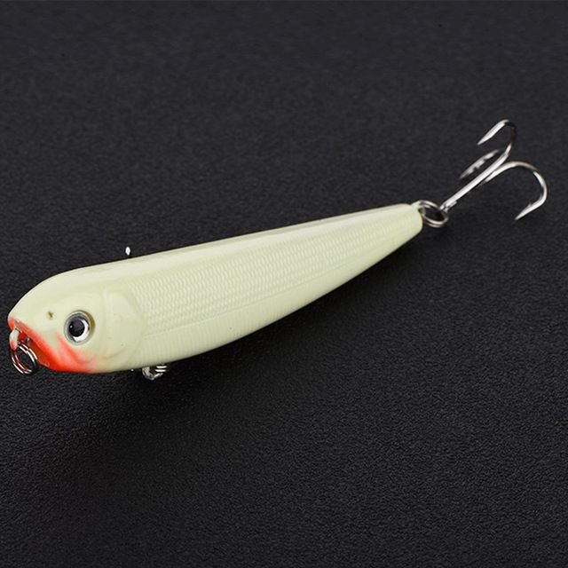 This luminescent fishing lure in the shape of a fish is designed for catching fish even in the dark. Simply illuminate the lure with a headlamp and you can fish after sunset. At the end, it features a metal treble hook.