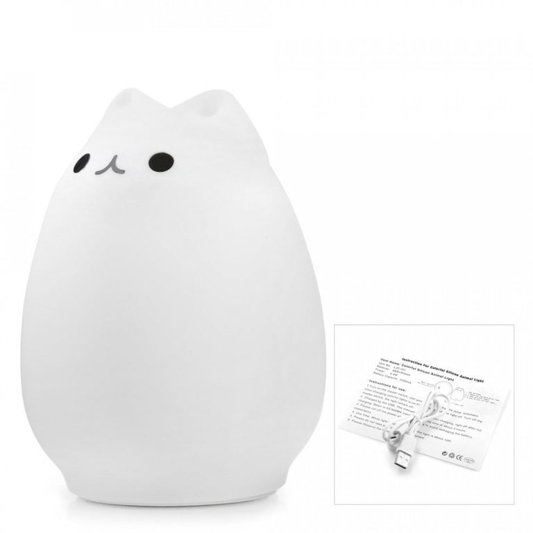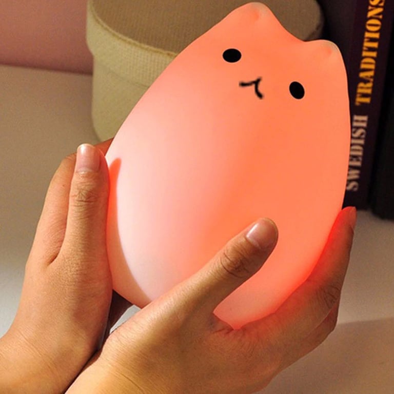 Illuminated LED decoration in the shape of a cat with a face. The lamp changes colours from white to blue, green, purple, and red.