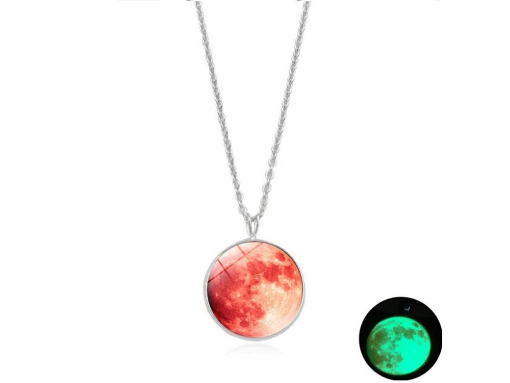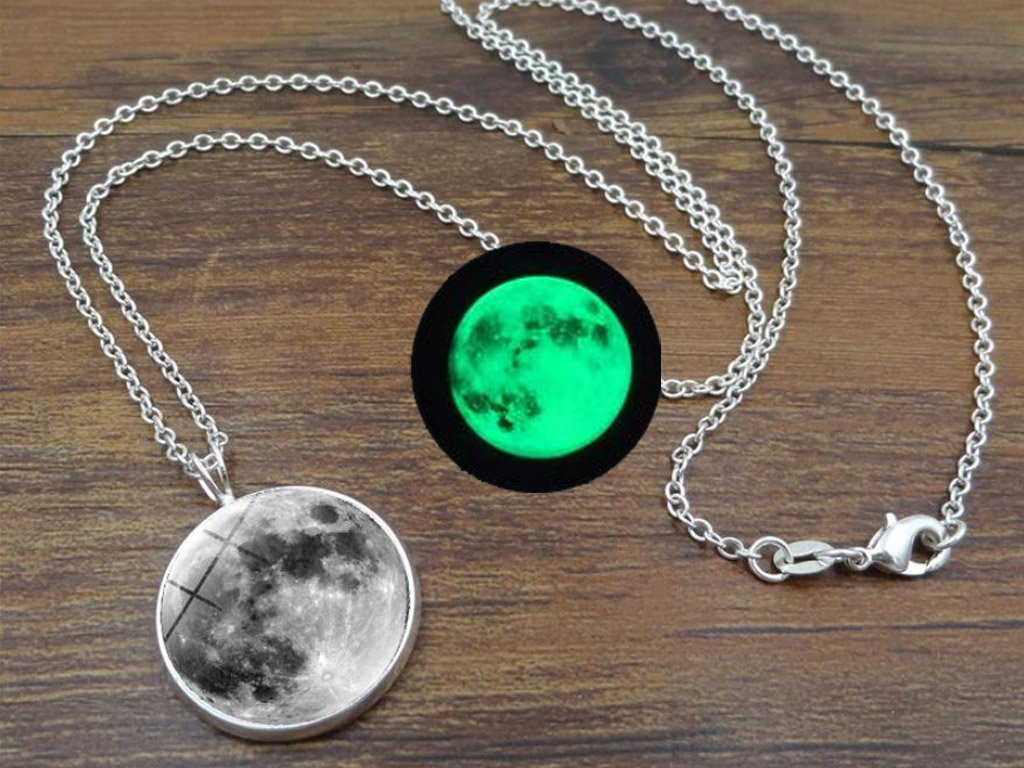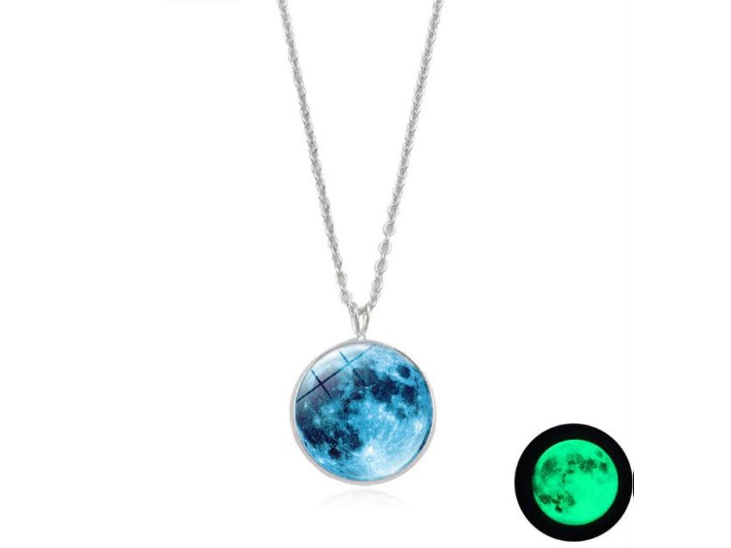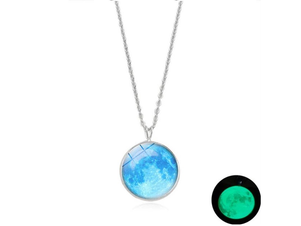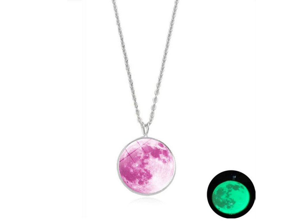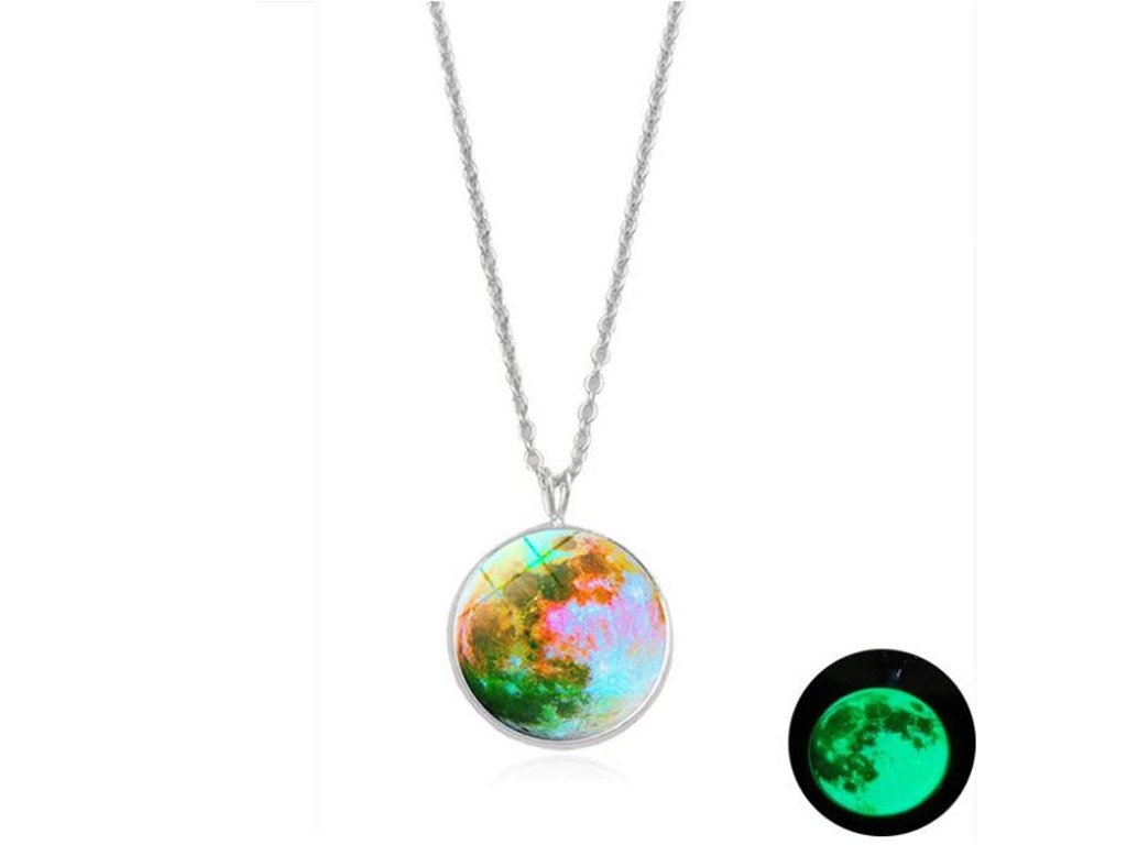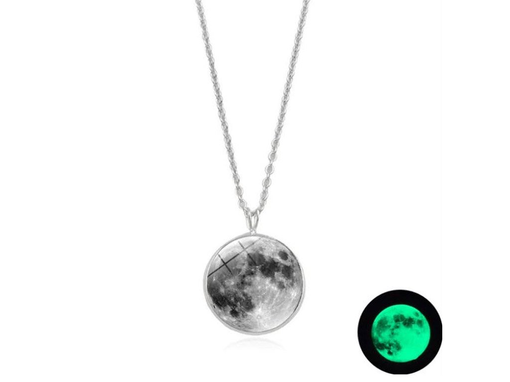 A stylish and charming pendant on a chain that glows when illuminated. This luminescent pendant featuring a Moon design is available in many colour variations.