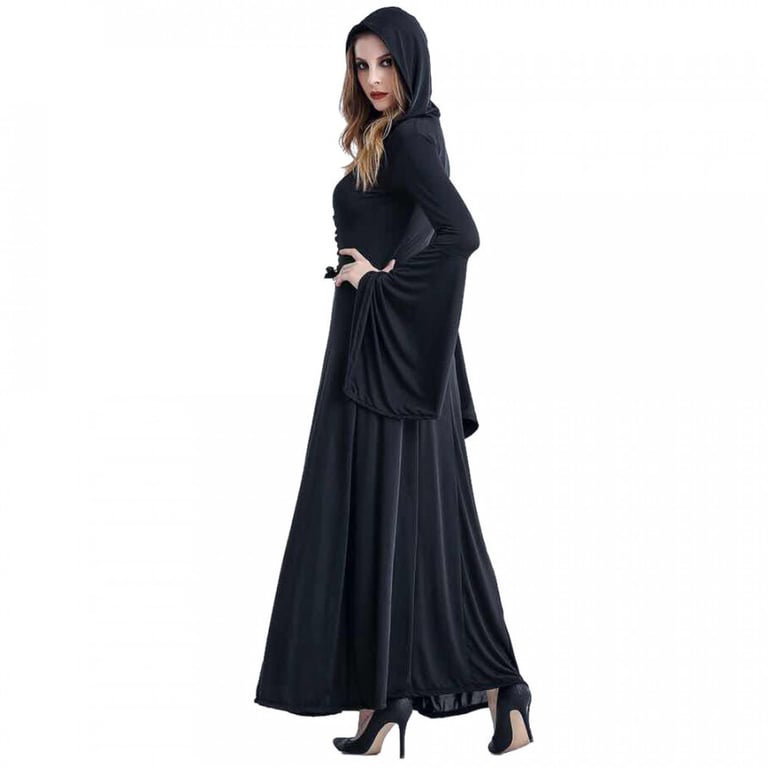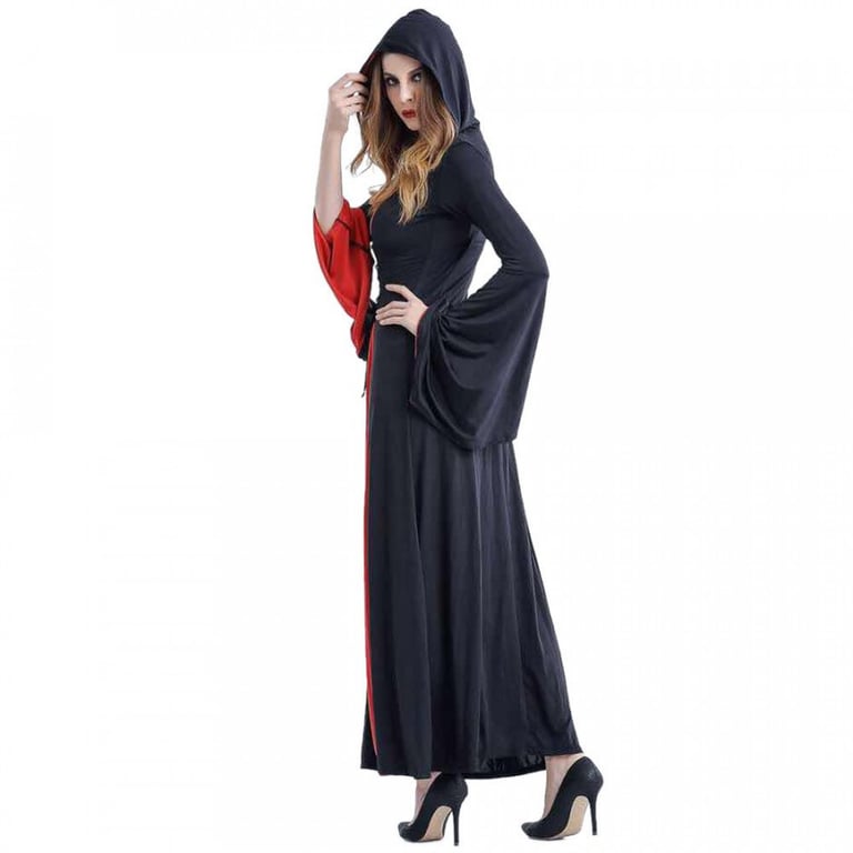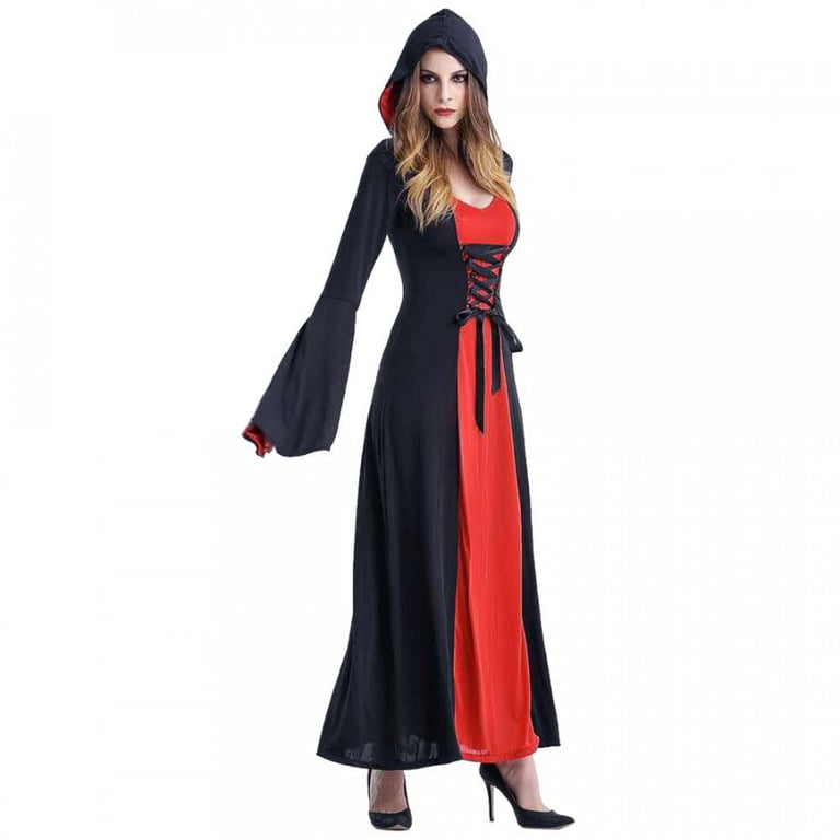 Women's gothic costume with ankle-length. The costume includes a dress with a hood, wide sleeves, a deep neckline, and a corset with lacing.