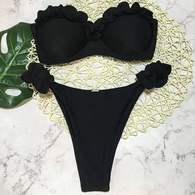 Women's two-piece swimsuit with ruffles. The top features padded cups and a push-up effect. The bottom has a high cut. Available in multiple colour options.