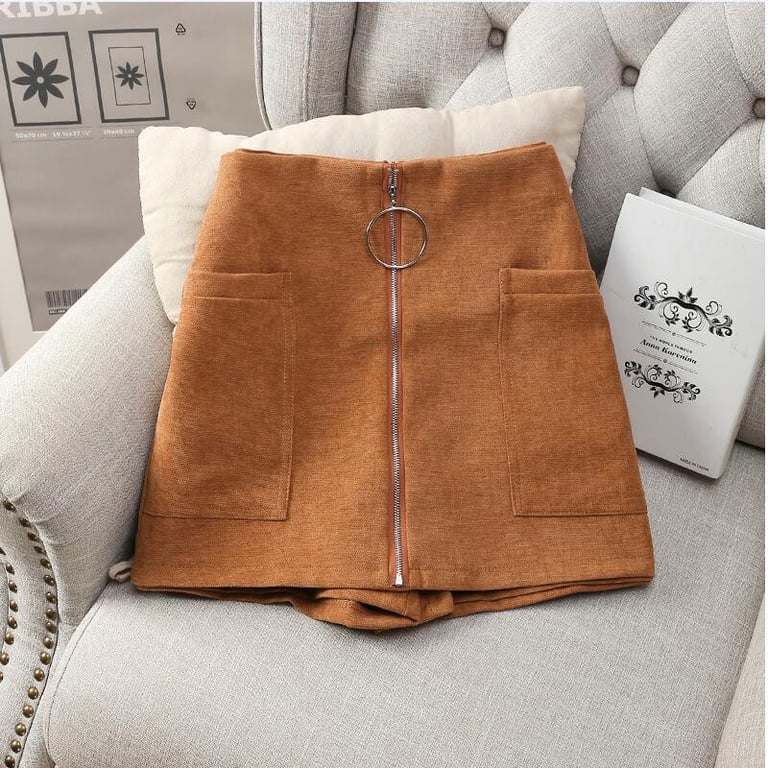 Women's short A-line skirt. Medium-high waist and decorative zip fastening at the front. Available in multiple colour options.