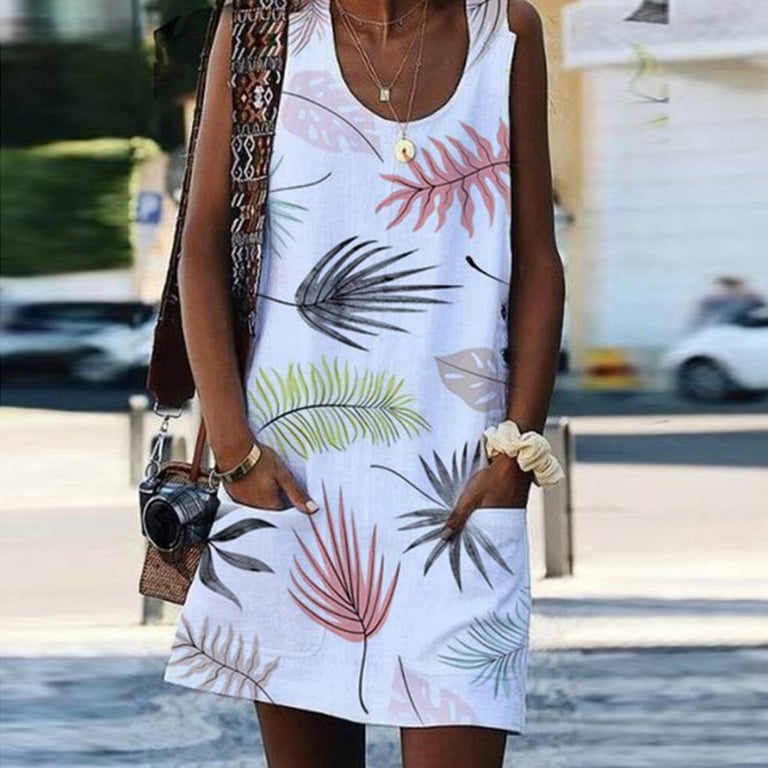 Women's sleeveless dress. Round neckline. Loose short cut with pockets. Colourful print. Available in multiple variants.