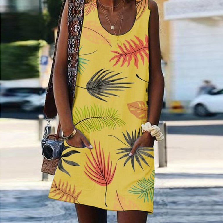 Women's sleeveless dress. Round neckline. Loose short cut with pockets. Colourful print. Available in multiple variants.