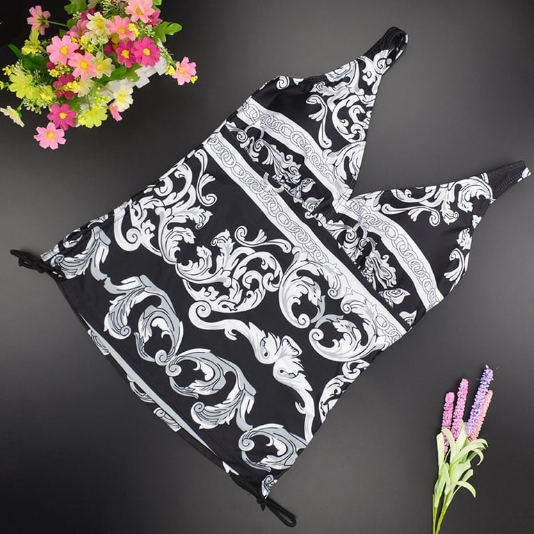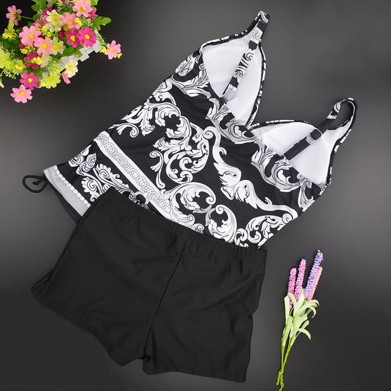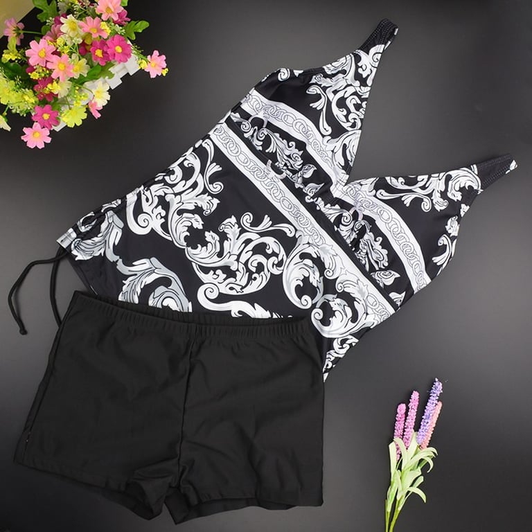 Women's two-piece swimsuit in black and white design. The top is long enough to cover the stomach with drawstrings and has a V-neckline. The bottom is a solid black with shorts.