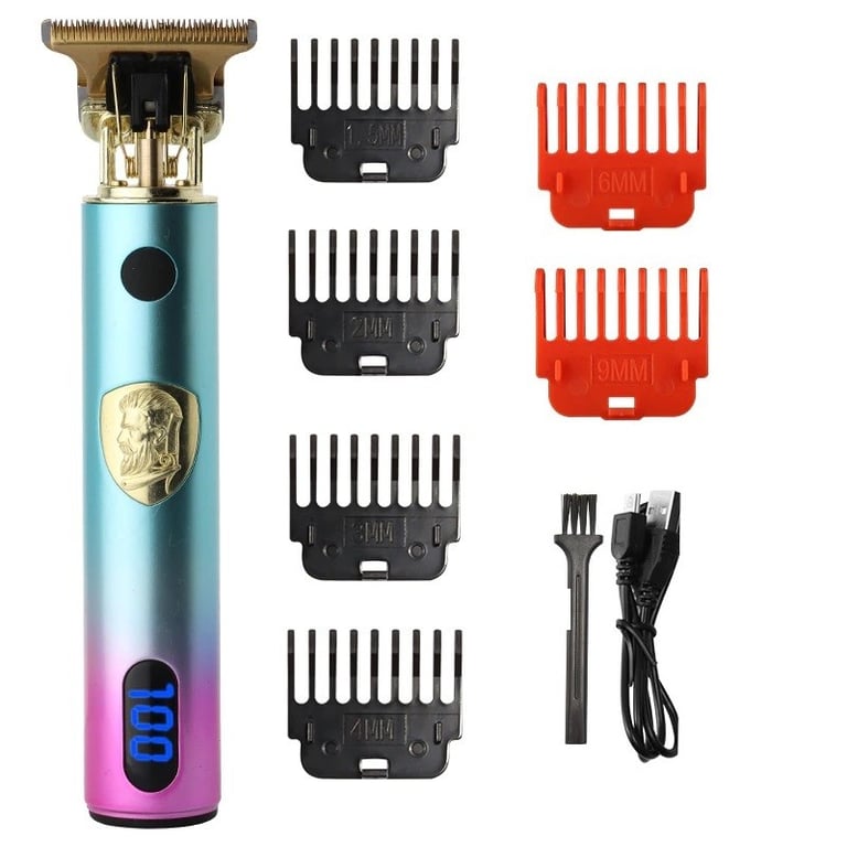 Package contents: 1x trimmer, 1x USB charging cable, 6x attachments, 1x cleaning brush