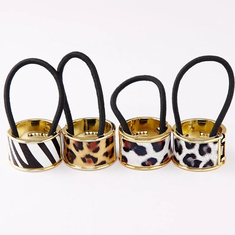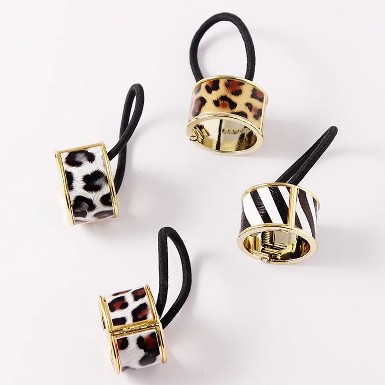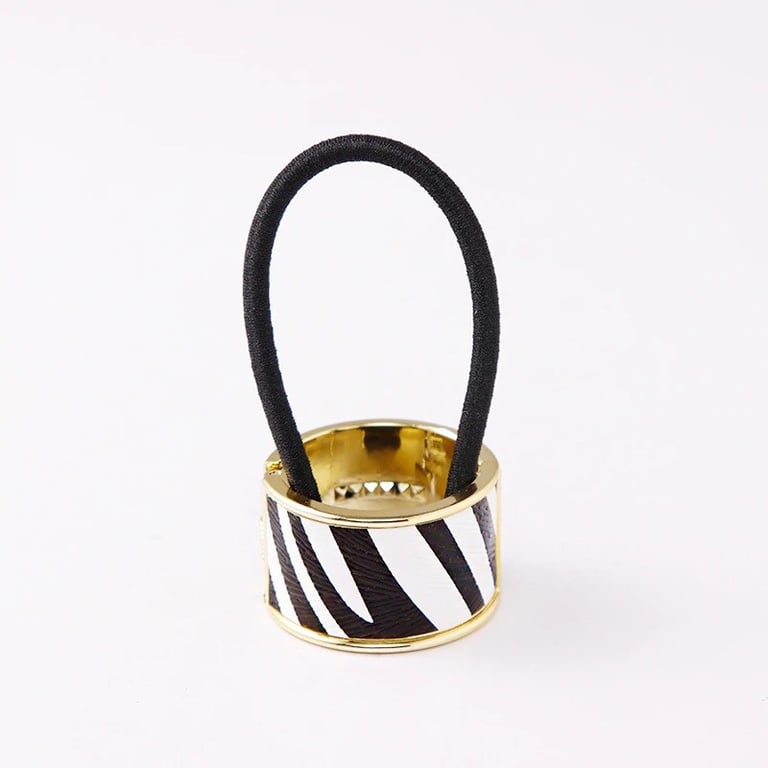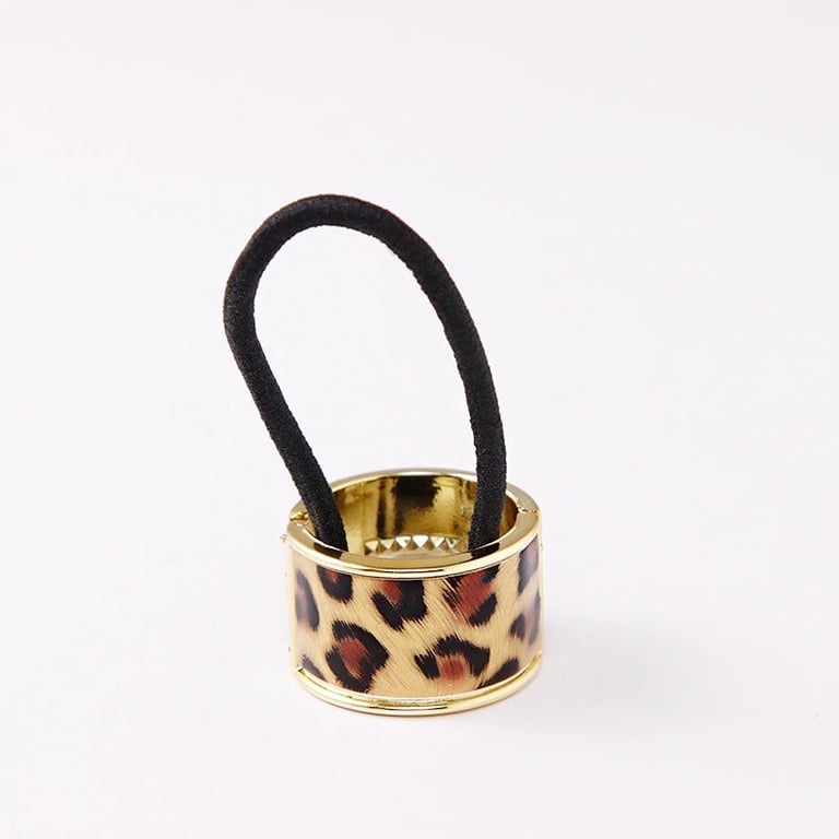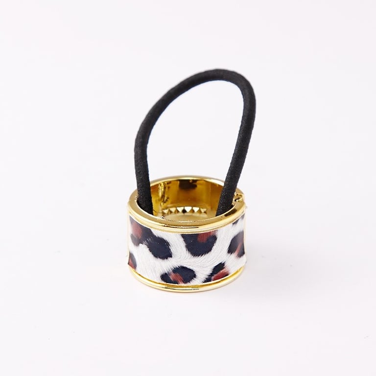 On a simple black hair tie, there is a round clip with animal patterns attached.